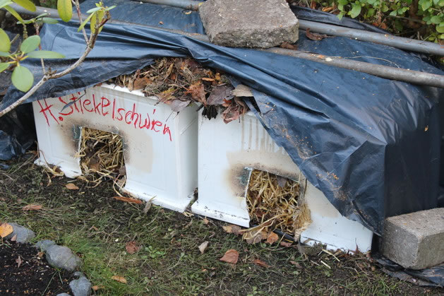 Also allens mischen, den Hefewürfel tweibröseln in't lauwarme Water, rühren (dat Suerstoff rinkümmt) un 2 Stünnen gären laten denn is dor richtig Schuum bavenop! Dat Ganze denn in de Geetkann, dat langt för 1m³ Kompost. Nu hett mien Naver de Hecken sneden un ik heff em den Snitt afnahmen. Dat kümmt op mien Worms-Kompost de mööt ok wat kriegen, un ik denk, wenn dor baven so'n dicke Schicht Bläder un Twiegen is, dat hett minner Gefohr dör Frost! Un ganz baven op den Heckensnitt kaamt twee lerrig schütte Plantenschalen, de ole Eer mit Plantenreste binn. Un süh!, de Worms kaamt dör düsse dicke Schicht Heckensnitt na baven krapen, dat se an de leckeren Saken kaamt! Worms sünd 24 Stünnen in eensento in Bewegen. Echte Workaholics, dat. De Biller köönt Se per