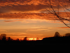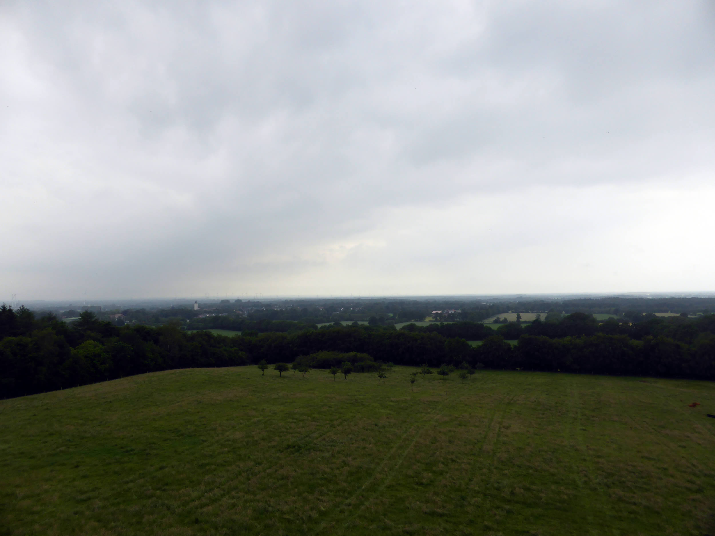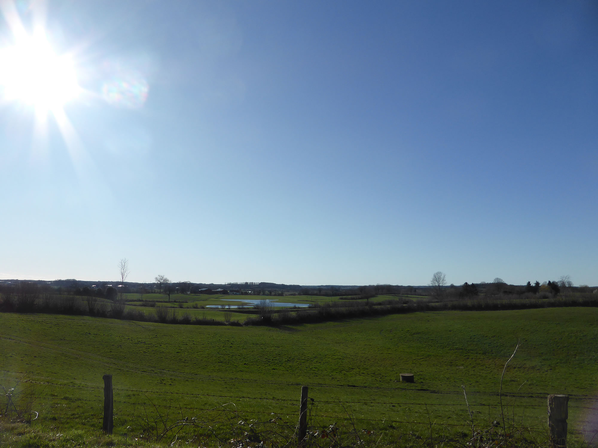Holstein vun sien schöönste Siet! Dat gifft doch nix Schöners as Wintersünnschien! De Heven is dörsichtig als Glas, dat Loof in de Knicks is weg, de Blick geiht över de Wellen vun't Gelänn wied bit an'e Kimm, un all Feller sünd mit Wintersaat as gröne Sied övertrocken. Man wat du dor sühst, wenn du dör de nakelten Knicks schuulst, dat is hüüt faken: en Seenlandschap, woneem keen henhöört. De Nedderslääg in düssen Harvst weern to veel! Un ok al nu gaht Ambosswulken feern över den Horizont. Jichenswoneem regent da. Schuer-Romantik!