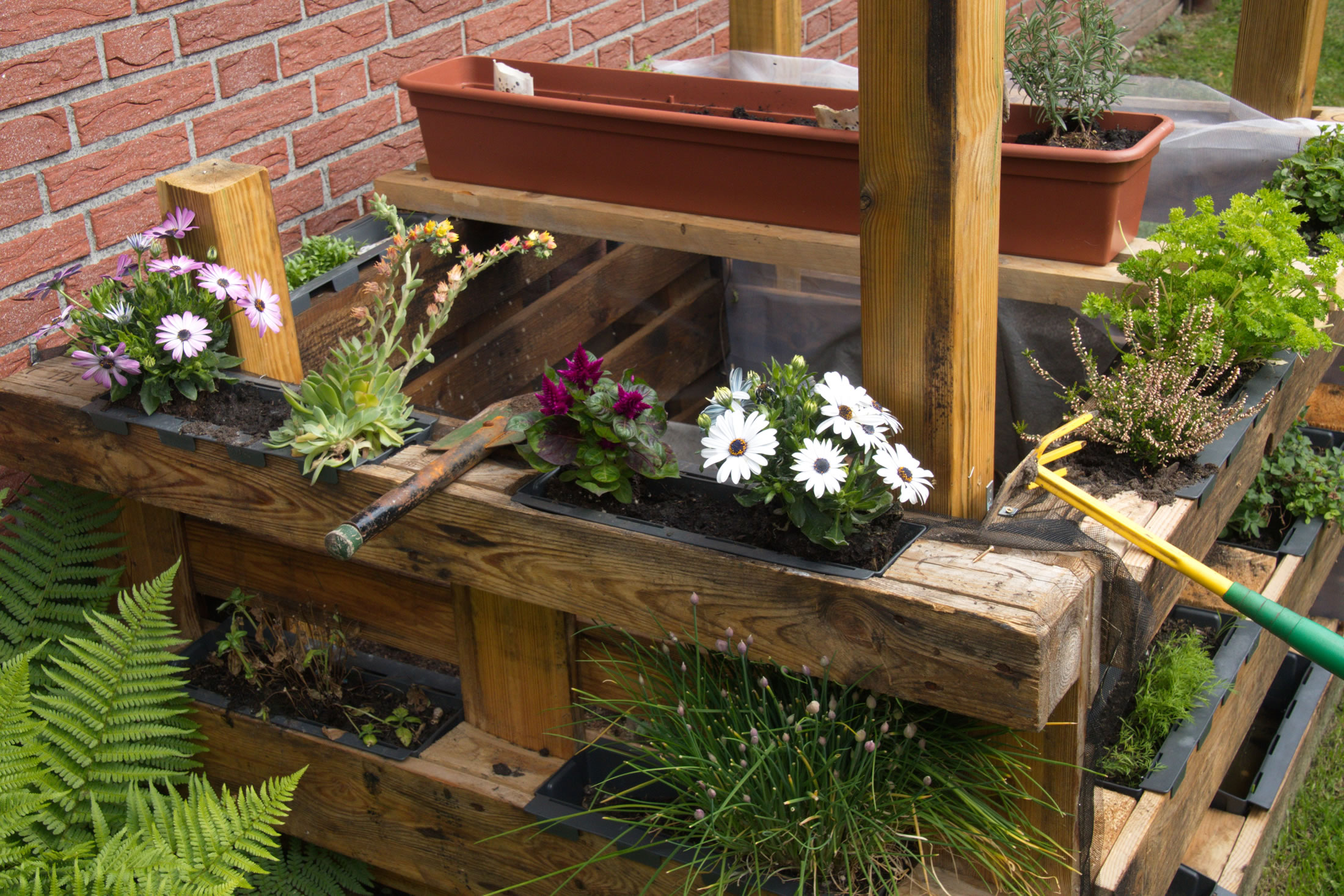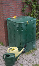 Bi mien Fru un mi hett dat ok de Kompost komfortabel. De Kompostbox an de Huussiet heff ik sülven buut un nu warrt se mit Blomen fein utstaffeert.