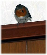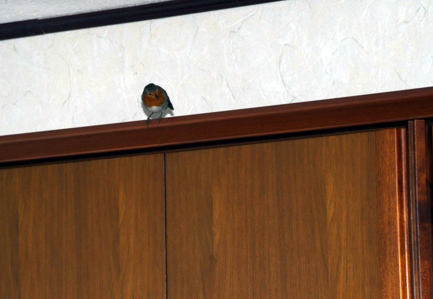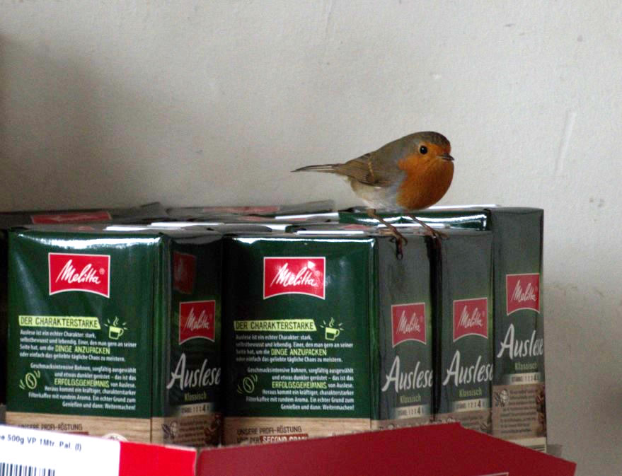 2.3.20 ....Lütt Roodbost kiekt op'n Koffi rin Ik höör dat jichenswo russeln un denk noch, dat is mien Fru aver nee, dat weer wen anners, en lütt Roodbost weer rinflagen! Toeerst seet dat in de Vörraadskamer un intresseer sik apensichtlich orig för den Koffi. Denn büx dat in de Wahnstuuv ut! Ik heff dat Finster wied opmaakt un gaaaanz vörsichtig den lütten Pieper na buten schuucht. De Vagels köönt dat ja nich af, wenn se to veel Stress kriegt, opletzt fallt mi de Buttscher noch in Amidam orr kriggt den Hartslag un tschüß. Nee, dat wull ik nich riskeern wo buten doch dat Fröhjohr op em töövt mit Sünnenschien un siene Leevste jichenswo! Aver för en poor Fotos harr ik Tied. Harr de Kamera jüst to Hand. De Biller köönt Se per Klick