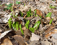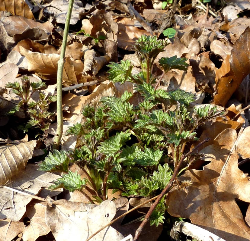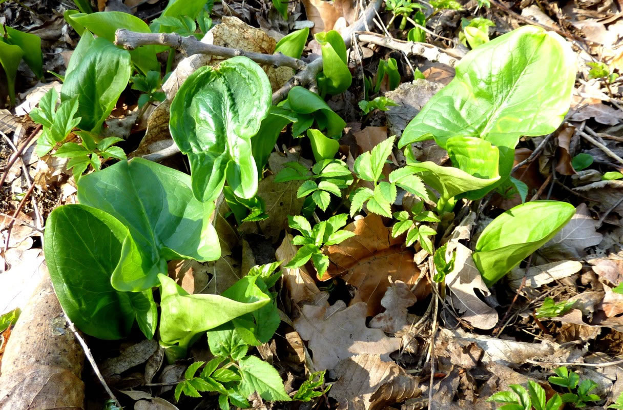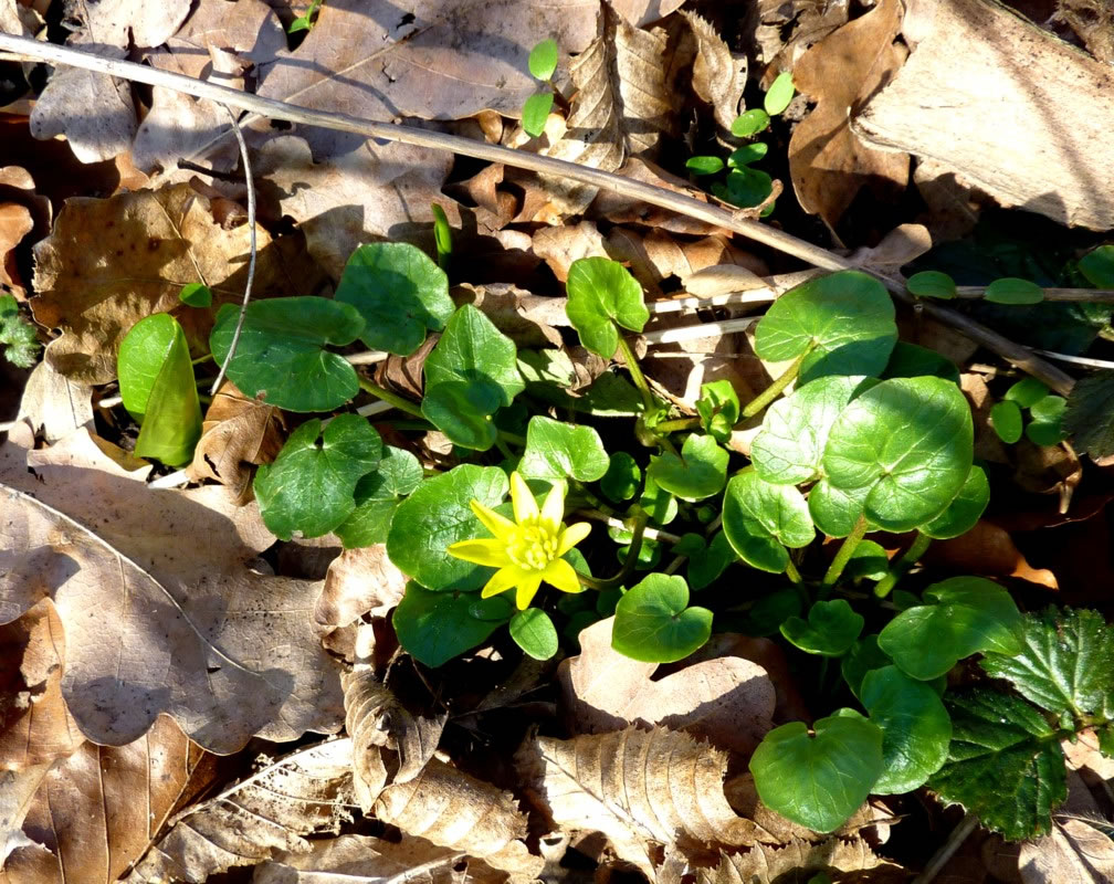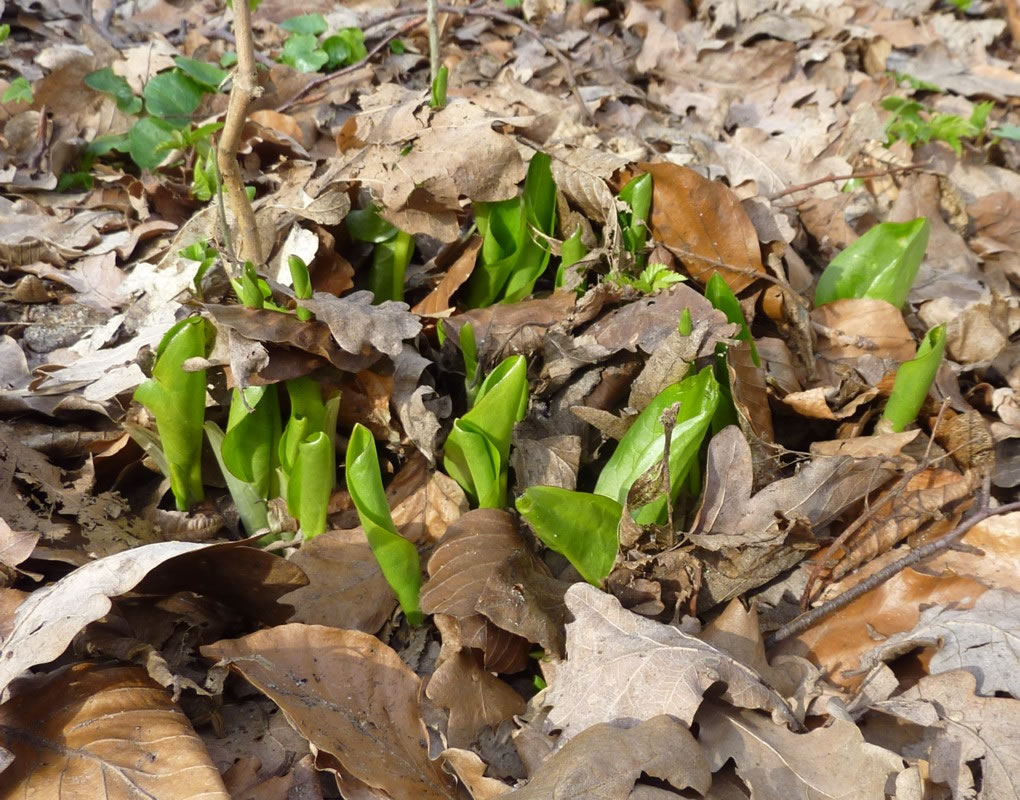 Besünners keken de grönen Bläder vun den Aronstab dörch dat Loof. Aver ok de Giersch un en Bült Brennnetteln harrn sik Platz maakt. Överall weern lütte Planten to sehn. De lütten Bläder vun dat Scharbocks-kruut lüchen gröön in den Sünnenschien. En Plant harr sogoor al en Blööt upmaakt. Mit ehr lüchend Geel weer se nich to översehn. Wenn dat so wieder geiht, sünd en Week wieder ok al de Buschwindröschen un de Primeln to sehn. Denn kann Oostern warrn! De Biller köönt Se per Klick
