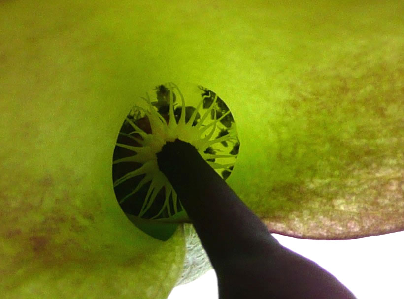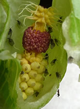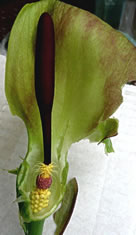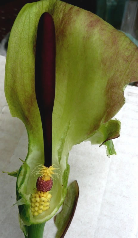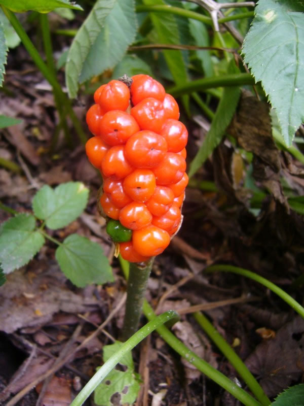 Överall an Wegrand un ut de Hecken kiekt he di in den April- un Maimaand an, de Aronstab! Meist as so'n Wiespahl. Mit sien düstern Sticken in en hellgröön, meist witte Tüüt is he nich to översehn. Kunnst em meist för enen Exoten ünner de Planten hollen. ![]() In't Fröhjohr sünd de saftigen Bläder dat eerst Gröön in dat verdröögt Loov. In'n Harvst driggt he lüchtend rode un giftig Beern an sien Sticken. He is meist to jede Johrestiet en upfallen Plant. Blots in'n Winter is nix vun em to sehn. Dat Verhollen vun düsse Plant hett mi neschierig maakt. Ik wüss, dat de Aronstab ok as Flegenfall betekend warrt. In de hellgröön Tüüt an dat ünnerst Enn vun den Sticken sünd de männlichen un weiblichen Blöden. Üm de to bestöven, lockt de Aronstab dörch den Aasgeruch vun den Sticken Flegen un lütte Insekten an. An den glitschigen Sticken rutscht de Insekten in de Tüüt un kaamt nich wedder na baben. Dörch den Versöök, na buten to kamen, verleert se den mitbröchten Blödenstoff an de Narben vun den Aronstab un bestöövt se. Dorna verdröögt de Tüüt, un de Döör för de Flegen vull mit niegen Blödenstoff is apen. Se köönt en anner Plant besöken. Een so'n Tüüt heff ik upsneden un se ünnersöcht. Un wohrhaftig weern in dat letzt Enn vun de Tüüt en ganzen Barg Flegen. Eerst dor heff ik so richtig begrepen, wat de Aronstab för en raffineert un intressant Plant is. De Biller köönt Se per Klick