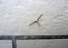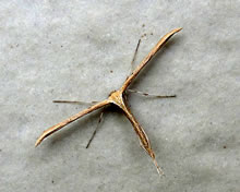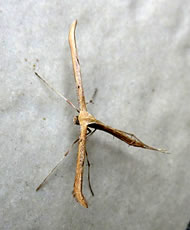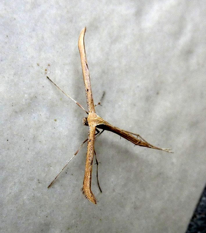 To Huus heff ik denn rutfunnen, dat dat en Federfalter is. Sien Naam is Emmelina monodactyla ut de Familie Federgeistchen. Wat hett doch de Fussel för smucke Naams! Bit lang heff ik den Naam Emmelina blots as Naam för Deerns kennt. De Biller köönt Se per Klick