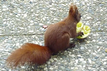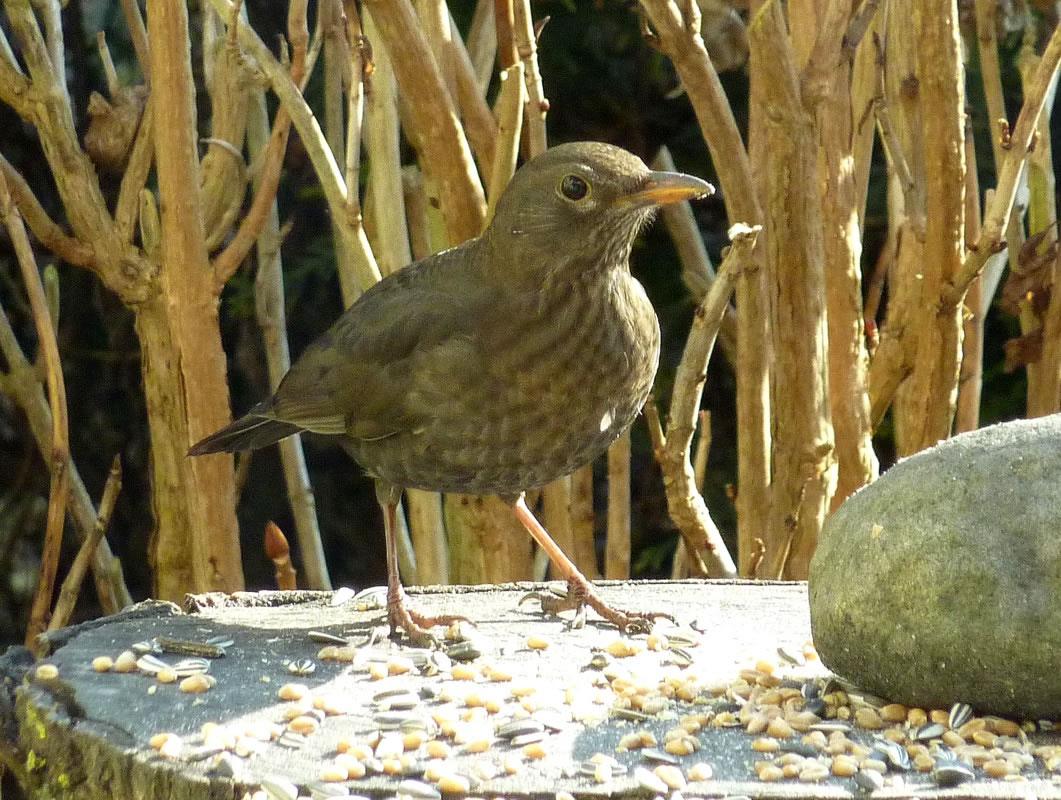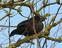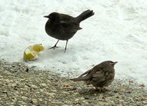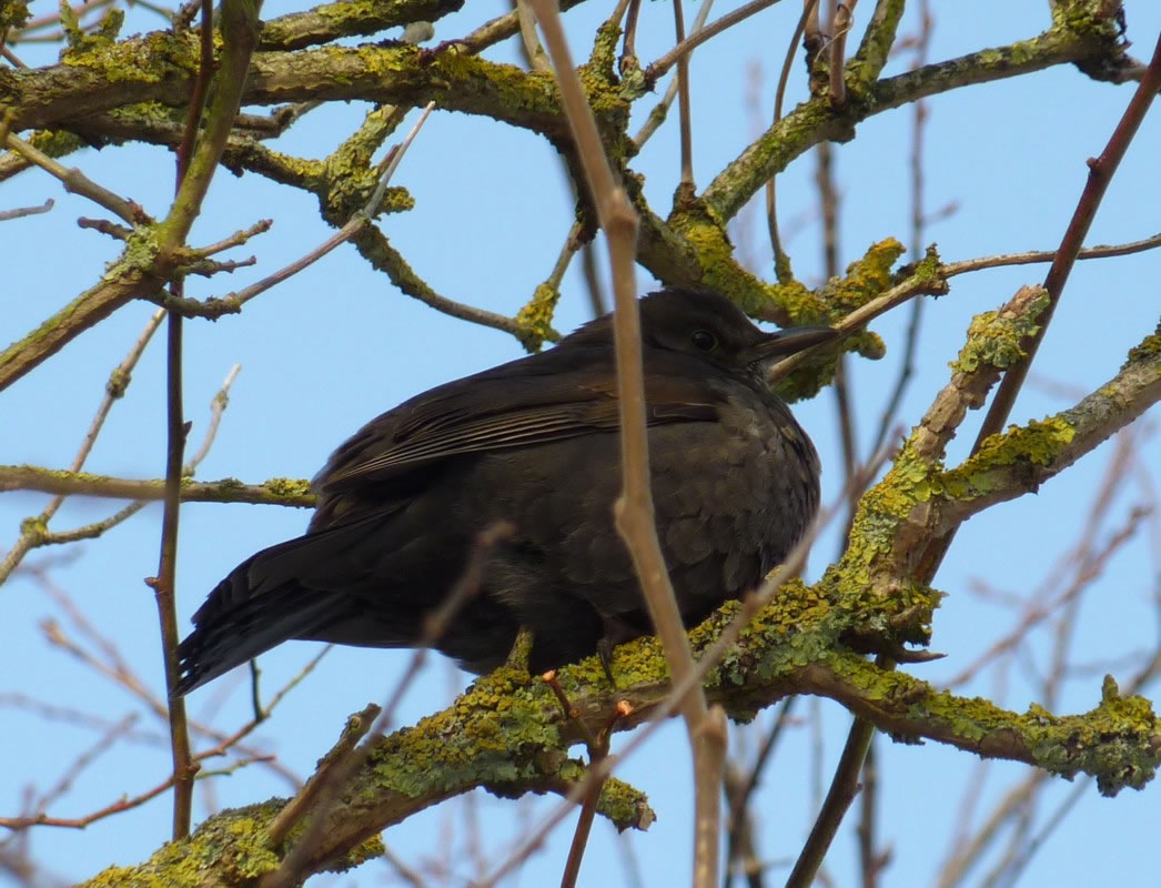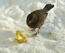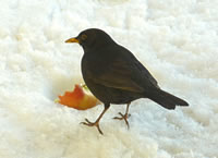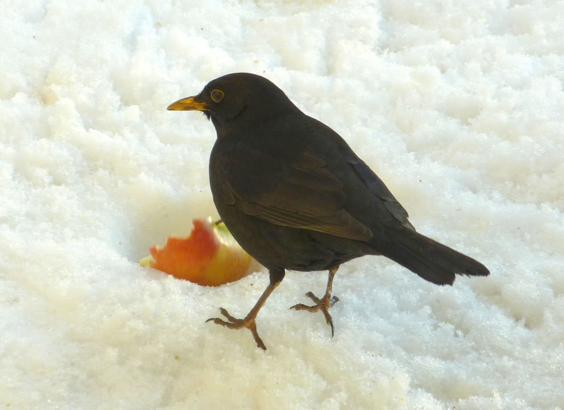 To geern maakt sik de Amseln över Appels her. Un dat nich blots in de Wintertiet. Wenn in Harvst de eersten Appels vun de Bööm fallt, sünd glieks de Amseln to Stell. Se pickt mit veel Kraasch in de Appels. Dor blifft blots de Schaal na. Kümmt en anner Amsel dor överto, will wat vun den Appel afhebben, denn gifft dat groten Larm un Zank.