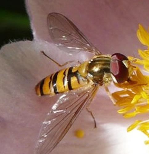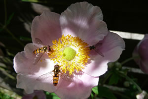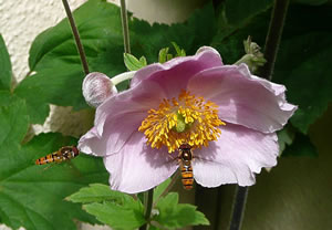 Se blöht wedder, de Anemone japonica oder Harvst-Anemone. Dörch dat Regenweder in den Augustmaand is se wat later ingang kamen. Luurt mal de Sünn mank de Wolken dörch, maakt se ehr smucken rosa Blöden wiet up. Glieks kaamt denn de Insekten anflagen. Een vun de Besökers is de Hainschweevfleeg. As so'n Kolibri