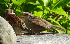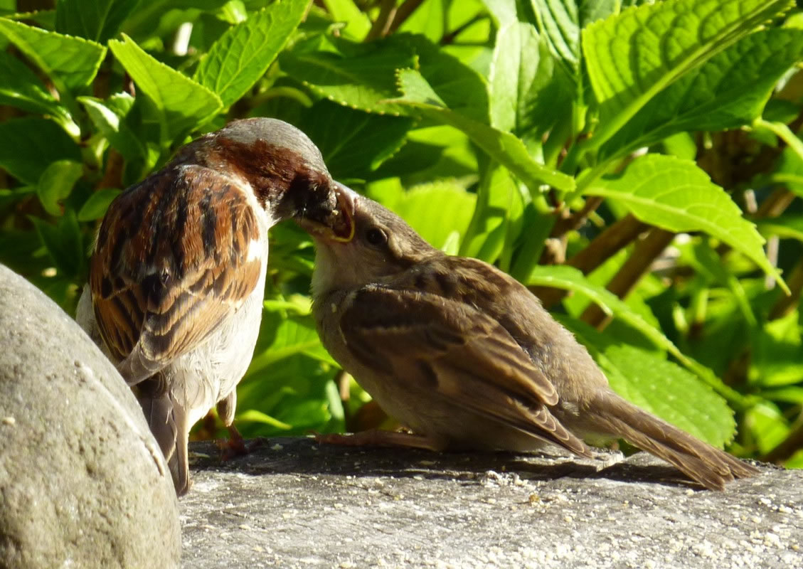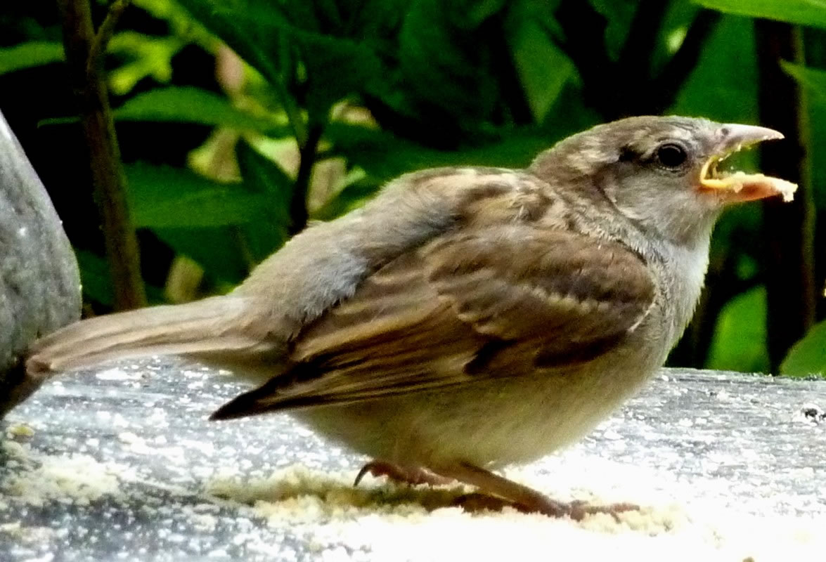 "Tschilp, Tschilp, Tschilp!", weer de lütt Lünk to höörn. Eerst seet he baben up de Plank un reep na Foder. Denn keem he mit sien Vadder daal up den Lünkendisch. De lütt Lünk kunn kuum de Tiet aftöven. He reet den Snavel wiet up un slöög wi wild mit de Flünken. Dorbi reep he ümmer luder: "Tschilp, Tschilp, Tschilp!" Endlich harr de Lünkenvadder up den Lükendisch mit sien Snavel noog Krömel tosamenraakt. Nu stopp he allens in den upreten Snavel vun den lütten Lünk. Vör en lütten Ogenblick weer dat denn still. Dat duur aver nich lang un dat Lünkenkunzeert un dat wilde Slagen mit de Flünken güng wieder. Dat güng so lang, bit de letzten Krömel vun den Disch weern. Denn flöög he mit sien Vadder to'n Naver. De Lütt weer wull noch nich satt. Seker geev dat dor ok wat to'n Freten. Wi harrn siet eenige Daag ümmer uns helle Freud, wenn sik dat Lünkenkind mit "Tschilp Tschilp Tschilp" anmell. De Lünkenmahltiet mit dat Kunzeert weer to un to nüüdlich. De Biller köönt Se per Klick