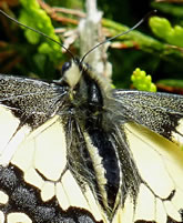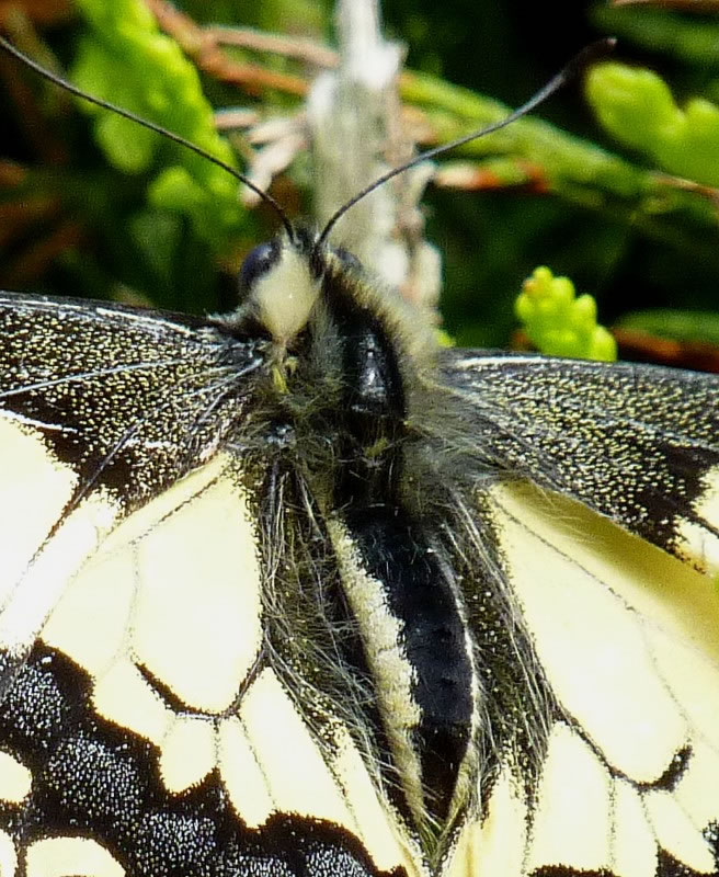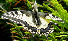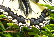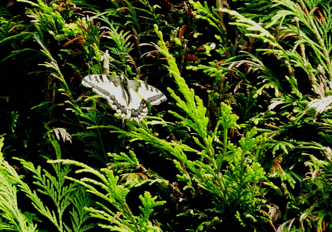 Dor heff ik mi em eerstmal genau bekeken. Oh, dat weer ja en ganz besünners groten un smucken Bottervagel. Dat weer ja en Swulkensteert (Schwalbenschwanz)! Den kenn ik betlang blots ut Böker. Den harr ik noch ni in mien Goorn to sehn kregen.
