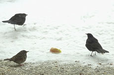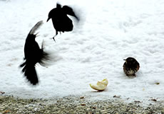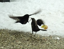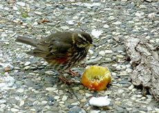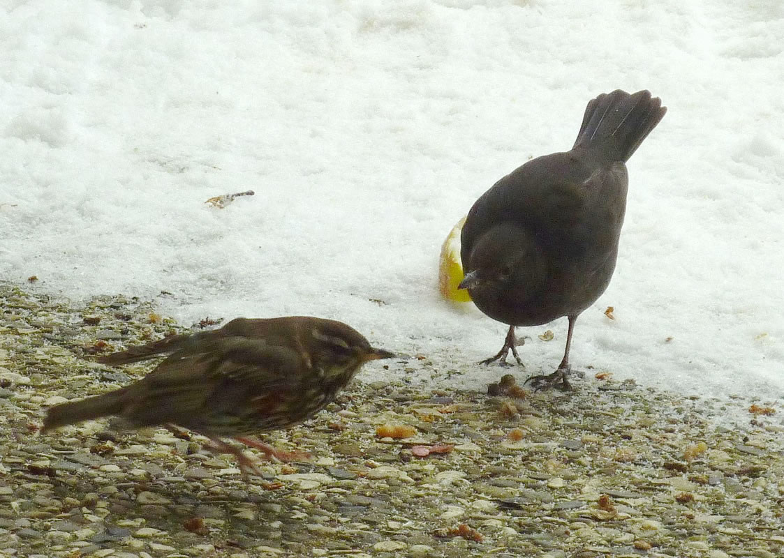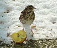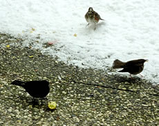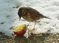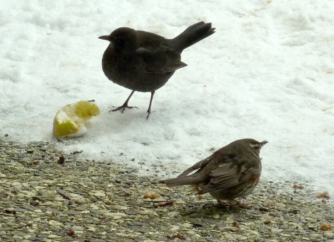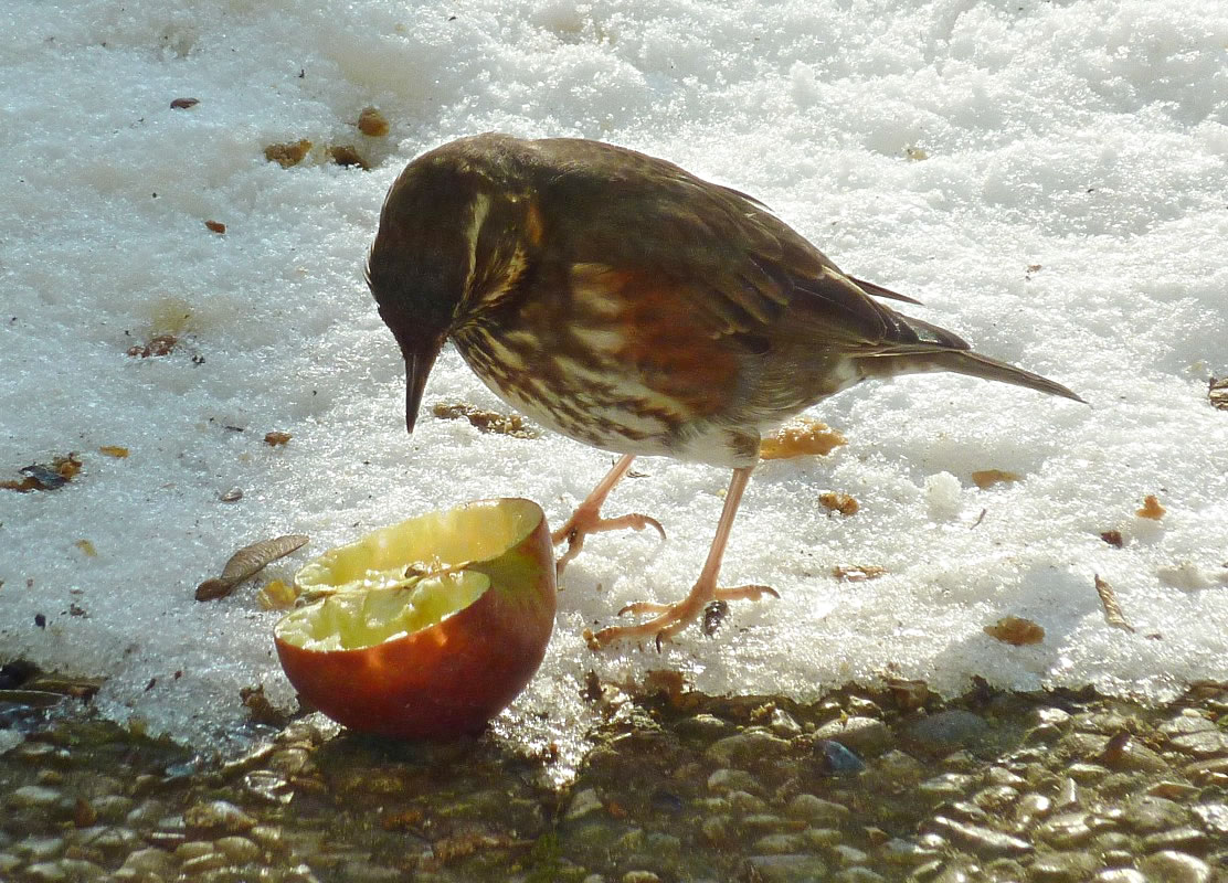 Düssen Winter geev dat veel un lang Snee. Dor heff ik för de Amseln to dat Vagelfoder extra lütte Appels inköfft. Heff se in veer Dele sneden un up de Terrass leggt. Glieks möken sik de Amseln över de Stücken her. Dat geev veel Larm un Zank. Ganz plietsche Vagels picken in en Appelstück un flögen dormit ünner de Büsch. Dor heff ik de Appels blots noch eenmaal dörchsneden un de Hälften na buten bröcht. De halve Appel weer för de Vagels to swoor un to groot. Nu müssen se sik up de Terrass vun de Appelstücken wat rutpicken. Dat hebbt ok anner Vagels mitkregen. Fremdoortig Vagels, Rotdrosseln, de blots as Wintergäst bi uns sünd, kemen jedeen Dag. Toeerst beluurn se de Amseln. Kregen denn aver Moot un picken ok vun de Appelstücken. Nu wöör de Zankeree mank de Vagels noch gröter. Mit groot Gezeter hebbt de Amseln de frömden Vagels verjaagt. Aver de weern nich bang. De Flünken utbreedt un mit spitzen Snavel güngen se up de Amseln daal. Aver nich blots anner Vagels bedenen sik mit de Appels. Ok de Eekkater harr Gefallen an de Appels funnen. Flink up lies Sahlen keem he anhuscht. Den buschigen Steert över den Rüüg leggt möök he sik över de Appels her un leet sik dat smecken. Ganz verbiestert keken de Amseln to. Ehr luut Schimpen help nich veel. Wenn den Eekkater dat to bunt wöör, nehm he en Appelstück in sien Vörpoten un vertröck sik dormit in enen Boom. Dat güng so gau, dor harrn de Vagels blots dat Nakieken. Oftins kunn ik bi den Zank vun de Amseln tokieken. Dat hett ok en Rotdrossel markt. As twee Amseln sik luuthals üm en Stück Appel zanken, keek de Rotdrossel to. Se nehm de Gelegenheit wohr un möök sik över dat Appelstück her. Dor kunn man richtig seggen: "Wenn twee sik üm en Appel zankt, freut sik de Drütte!"