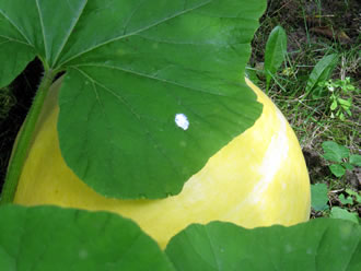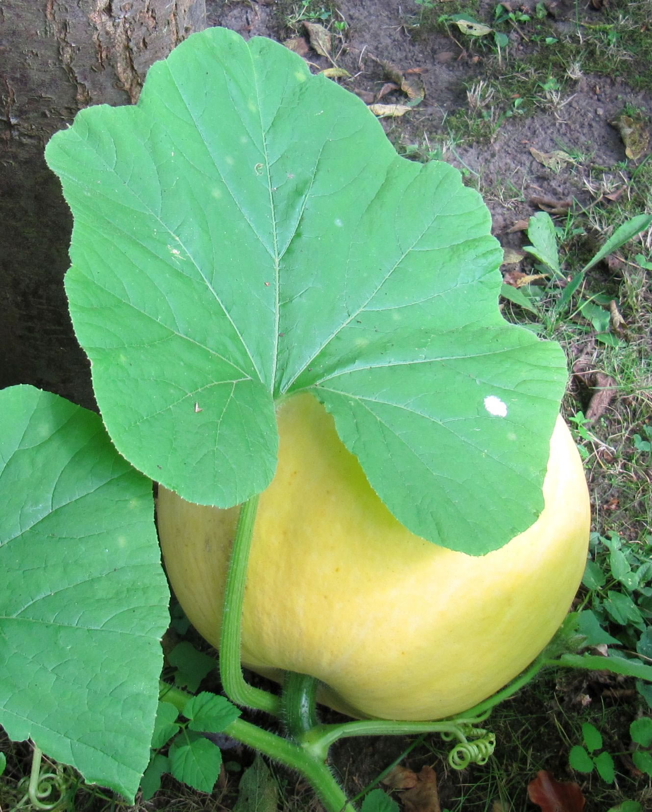 Kürbis ran. He liggt komodig mank Kürbisranken un Kürbisbläder