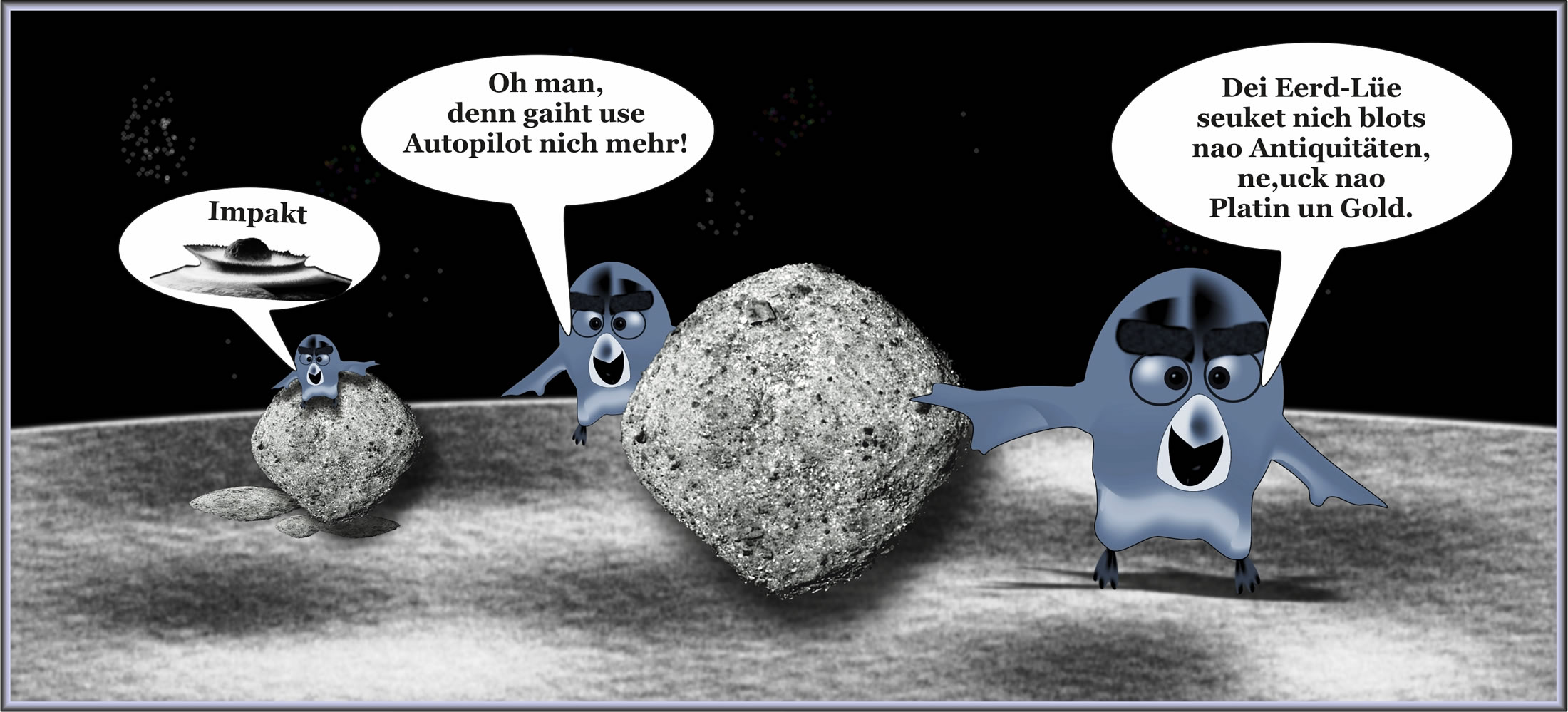 van Ludgerd Lüske Mit OSIRIS-REx will man rutfinnen, woher wi Menschken kaomt un wat use Rulle in dei Welt is. Asteroide bestaoht ut äöwer bläben Schutt bi dat Entstaohn van dat Sünnensystem. Dei käönt Künne bringen tau dei Geschichte van dei Sünne un dei ümloopen Planeten. TAGSAM heit dei Probennähmer-Gelenkarm van OSIRIS-REx, dei an't End einen Upnaohme-Kopp dräg. Bi dei Up-un-Aff-Aktion langt dei Arm nao den Bodden van Bennu. Dei Ruumschipp-Impuls drückt den Upnaohme-Kopp dorbi rund fief Sekunnen lang up den Asteroid-Bodden, jüst lange naug för ein Probenähmen. Bi den Bodden-Kontakt blaost Stickstoffgas binnsiete van den Kopp up den Bodden. Stoff un lüttke Steinkes werd hoch puußt. An dei Kante van den Kopp werd dit wegfleigen Wark in eine Kring-Kaomer upfangen.