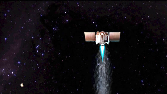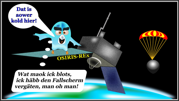Dit Bild wiest dei OSIRIS-REx-Sonde, dei den Asteroid Bennu verlaoten dait. Dei tweijöhrige Trügg-Reise nao dei Ern kann nu losgaohn. OSIRIS-REx ist dei eierste NASA-Mission, dei einen erdnaohen Asteroid besöch, dei Bäöwersiete ünnerseuken dait un eine Probe upnimmp, dei nao dei Ern trügge kummp. Nömdaogs bi'n Uhr off veier (EDT) krigg dei OSIRIS-REx-Kontroll-Ruum in Littleton, Colorado, eine Naoricht, dat dei Ruumsonde 16 Minuten eiher ehr Hauptstraohl-Ruder zündet har. So kann dei sick ut den Asteroid-Ümloop rutwarken. Nao 7 Minuten Brennduur van dei Driew-Warke kann dei lange Trügg-Reise van OSIRIS-REx mit 60 Gramm Asteroid-Materiaol an Bord losgaohn. Dei Affloop van dei Trügg-Reise van OSIRIS-REx is dat üppste Wark van dei Sonde nao dei Ankunft bi Bennu in dat Johr 2018. Dat Ruumfohrtüg-Straohl-Driew-Wark mutt dei Sonden-Geschwinnigkeit üm 958 Kilometer in'ne Stünn ännern. So werd OSIRIS-REx den Erd-Ümloop üm dei Sünne draopen un an'n 24. September 2023 dei Materiaol-Probe äöwer den Utah-Test- un Manöverplatz affschmieten.