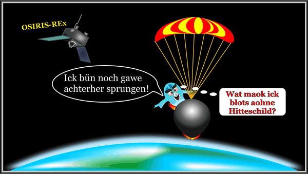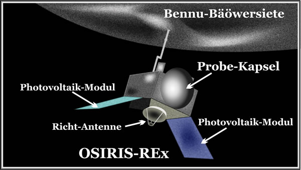 Dit Mosaikbild van den Asteroid Bennu bestaiht ut 12 PolyCam-Biller, dei dei OSIRIS-REx-Sonde an'n 2. Dezember 2018 mit einen Affstand van 24 km upnöhm. Mehr hier: NASA-Video. Dit Bild van dei OSIRIS-REx-Proben-Trüggbring-Kapsel knipsde in'n März 2017 dei StowCam-Imager van dei Ruumsonde.
