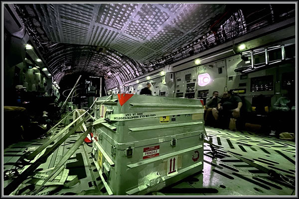 Ein Schipp-Container mit den Materiaol-Kanister mit dat Materiaol van den Asteroid Bennu ist an Bord van einen C-17-Fleiger van dei US-Luft-Striet-Macht fasteschnallt.