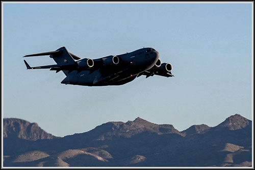 Ein C-17 Globemaster-Fleiger mit den Wätenschup-Kanister an Bord häwt an'n Maondag, den 25. September 2023, van dat Utah Militär-Feld aff. Dei C-17 is ünnerwägens nao dat Johnson Welt-Ruum Zentrum van dei NASA in Houston, Texas.