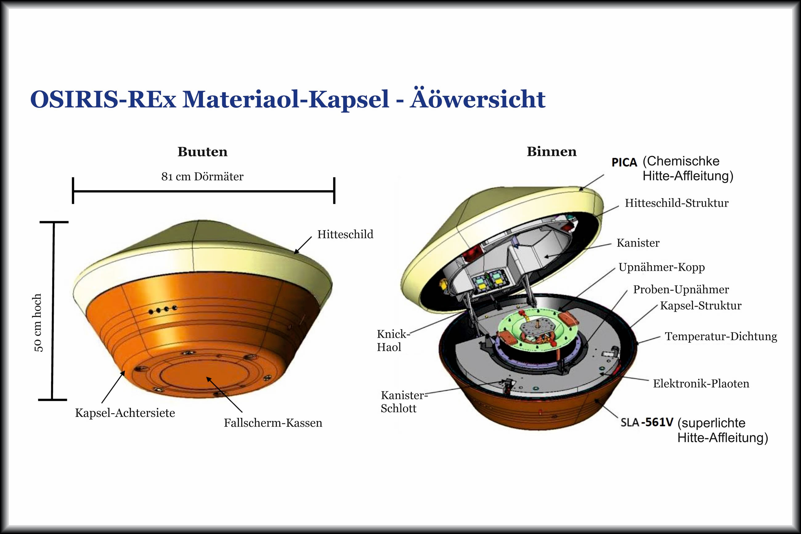 Dei OSIRIS-Rex-Materiaol-Kapsel is aopen van Ludgerd Lüske Süh ok hier: "Dreck ist Materie am falschen Ort", dat Zitat schall van Brecht oder Tucholsky oder Mary Douglas stammen. In dei Kapsel van dei Osiris-Rex-Sonde sünd ca. 250 g Dreck van ein wied entfernte Stäe, dei hier aver kein bäten as Dreck behannelt warrt: Sei sünd welk van dei weltwied kostborsten Dreck-Substanzen. Up 60 Gramm harr man tauminnst hööpt, 250 g sünd ein grote Erfolg, un liekers blifft elk Gramm weertvull.