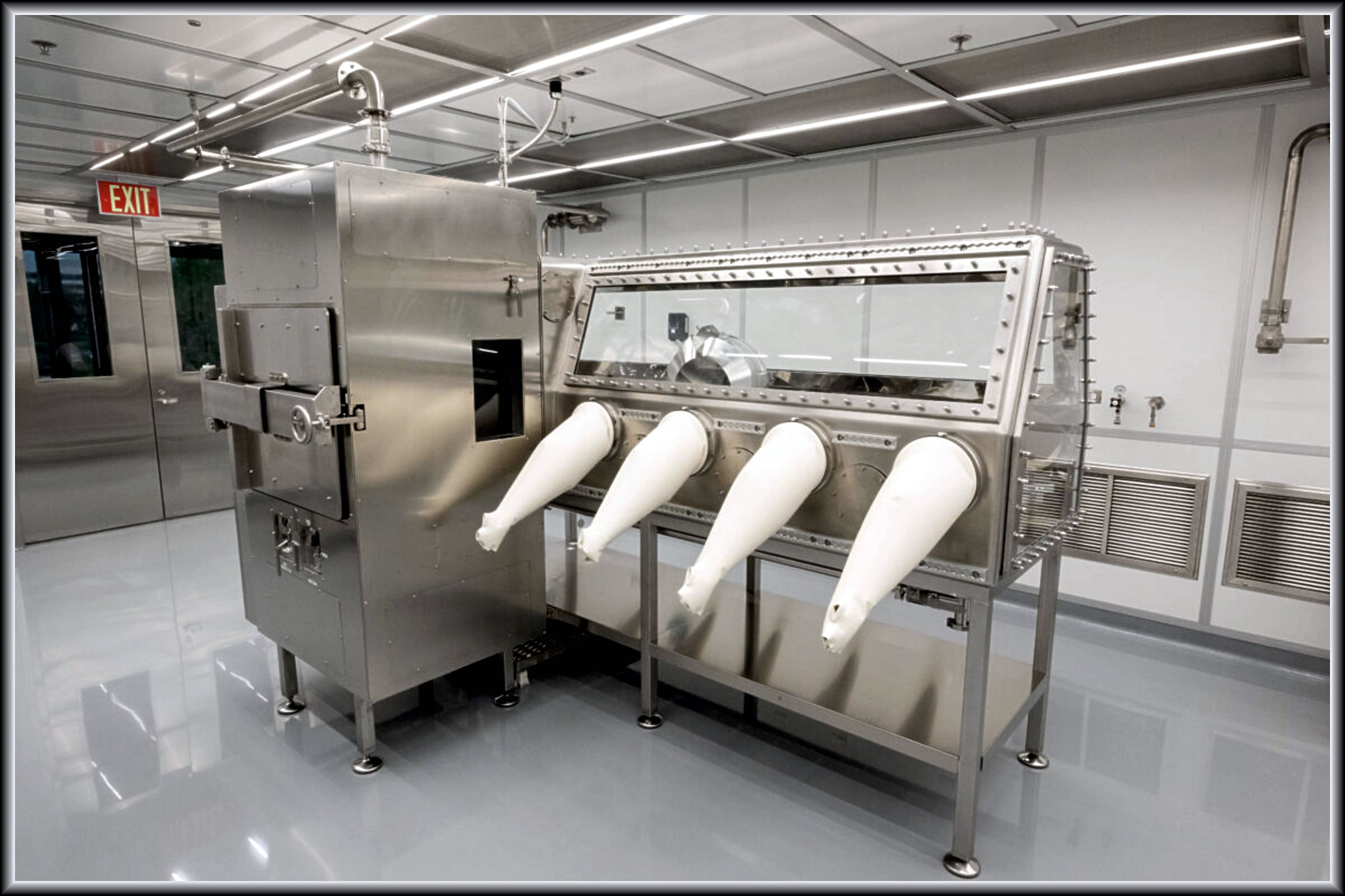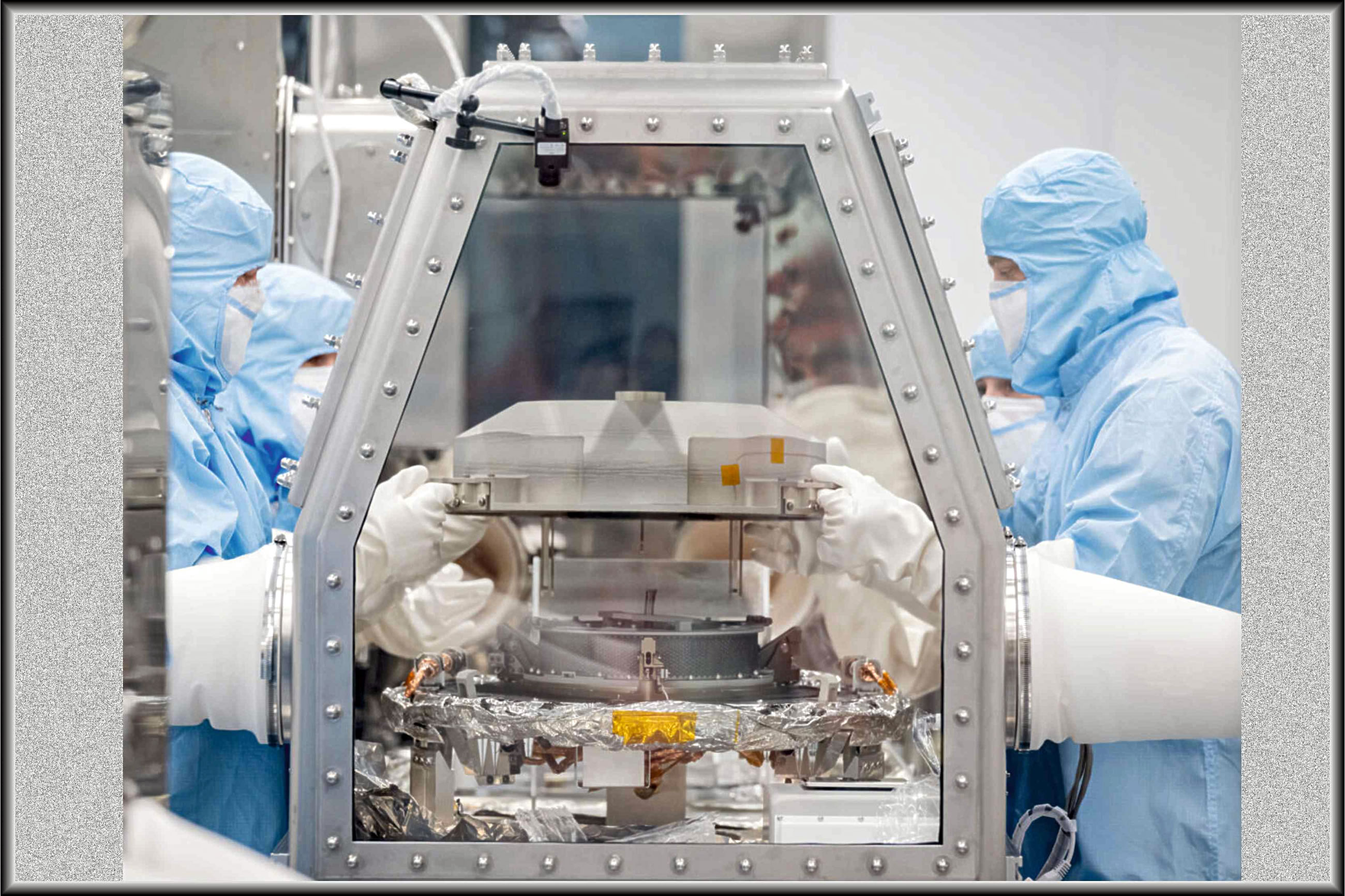 Woans dei Reinruum warket, wiest dit Bild dei grote Momang: Levi Hanish un Michael Kaye, Uphaol-Spezialisten van Lockheed Martin, nähmt den Deckel van den Materiaol-Kassen aff. Dei Gummihanschen wieset nu in dat Binnere van den Ruum.