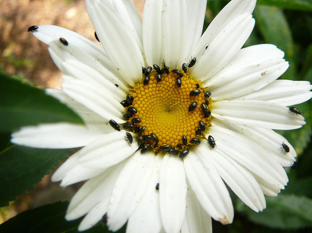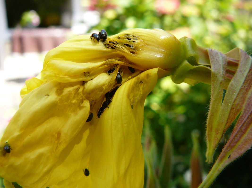 ![]() Sitt en Imm binnen an dat Finster, denn fang ik ehr in en Glas un bring ehr na buten. Spinnen faat ik an ganz suutje un dreeg ehr an de Luft. Flöh, de möögt mi. To'n Glück, to ehr Glück, heff ik lang kenen hatt. Ik geev dat to: Mit de wöör ik anners ümgahn. Man nu, nu sitt överall lütte, swatte Käfer! Dor fallt mi nix to in! "Ihhh...!", bölk uns lütt Naverdeern, "ihhh..., Mama komm mal snell!", un denn wies se up de sünnengelen Ringelblomen, de nu meist swatt weern. Miene schönen gelen Rosen sitt vull. Stina jammer, ehr weer de ganze Utfloog an den Strand "vermiest, einfach eklig". Meist inhüllt weer se west in en Wulk vun lütte swatte Punkte. Mien Badedook mit gröne un gele Striepen hüng buten to'n Drögen. Vull vun disse swatten Dinger! Utschütteln hett nich holpen. In de Waschmaschin steken ok nich, de Beester seten dor achteran jümmers noch in. Morgens Klock acht sitt wi up den Balkon, de Luft is frisch, de beste