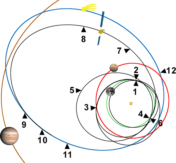 Fleigbaohnen Et giff tau Tied kiene Drägerrakete, dei eine so schwore Last direkt up dei Baohn van einen Komet bringen kann. Dortau ligget Dei Eern un dei Kometen in dat Gravitationspotentiaol van dei Sünne tau wiet uteinanner. Dei bäöwerste Arianestufe bröchde Rosetta blots up eine Baohn duune bi dei Eern üm dei Sünne ümtau, somit blots ut dat Gravitationspotentiaol van dei Eern rut. Dit is in dat wieste Diagramm mit "1" anteiket. Nao ein poor Daoge stünd faste, dat man dei vörseihn Baohn nau naug draopen har, so har Rosetta naug Driewstoff för dei heele Mission, uck besünners för dei Baohnkorrekturen bi dat plaonte Vörbifleigen an dei beiden Asteroiden. Ein Johr läöter, an den 4. März 2005, flög Rosetta ein eierstet Swing-By-Manöver, wobi dei Sonde bit up 1900 km an dei Eern ranköm. Dei Sonde was vör dit Draopen "2" ein bäten butsiet van dei Eerdbaohn flaogen un dei Eern har dei mitschläpet un up Geschwinnigkeit bröcht.