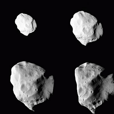 Impaktkraoters. Rosetta köm an den 10. Juli 2010 an den rund 100 km grooten Asteroid (21) Lutetia in einen Affstand van 3162 km un eine Relativgeschwinnigkeit van 15 km/s (= 54000 km/h) langers.