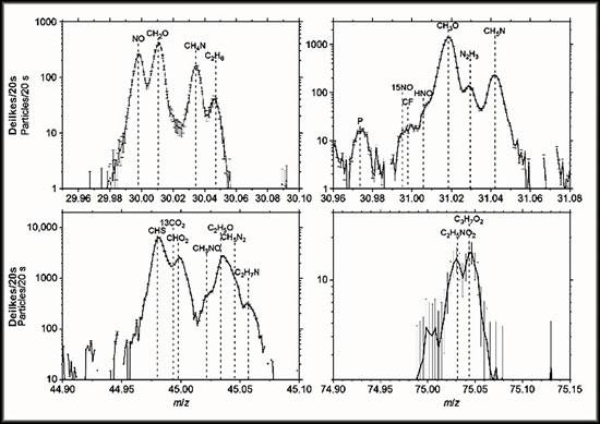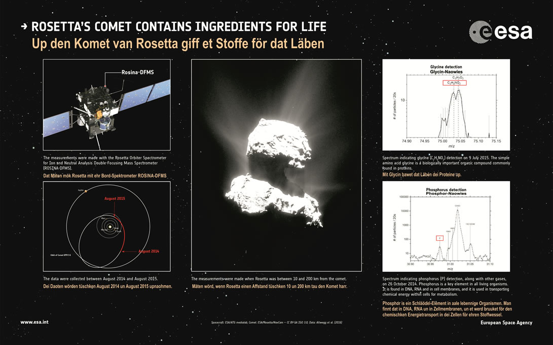In dei Massenspektren baoven werd dei Stücktaohl van dei up den Detektor ankaomen ioniseierten Deilkes as eine Funktion van dei Laoge up den Detektor wieset, as ein Masse/Laodung-Verhollen (m/z). Man funnt Glycin (C2H5NO2) mit 75 Dalton (afkortet Da), Methylamin (CH5N) mit 31 Da un Ethylamin (C2H7N) mit 45 Da. Dei Köppel van dat Molekül-Ion CH4N+ is dei gröttste, un et entstaiht bi dei Stöt-Ionisation van Glycin mit dei Masse 30 Dalton (Da). Et kann aower uck ut dei beiden annern Amine affstammen. Aale Molekül-Ionen werd dör dei Naober-Massenpeaks van dei tauhören Stamm-Moleküle affscheert. As Bispill finnt wi C3H7O2+ mit dei Masse 75 Dalton pro Elektronenlaodung (Da/e). Dat is woll ein Restmolekül van Propylenglycol (C3H8O2), off van ein Isomer, off sogar van schwörere Moleküle, so as van Butandiol (C4H10O2). Mehr äöwer dei Daten-Anaolyse för Rosina DFMS finnt man in eine Studie van Le Roy et al. Väle Biller krieget wi opstunns van den 67P-Komet "Tschuri". Van dei heele Rosetta-Mission hätt dei ESA tau'n Johreswessel dei Biller for den allgemeinen Bruuk freigäben (süh ESA-Bildarchiev un süh ESA-Biller, aktuell). Dei Rosetta-Sonde sendet jeden Dag neie Biller. Dat löpp noch bit tau'n September 2016. Denn schall Rosetta sülwes up den Komet 67P landen.