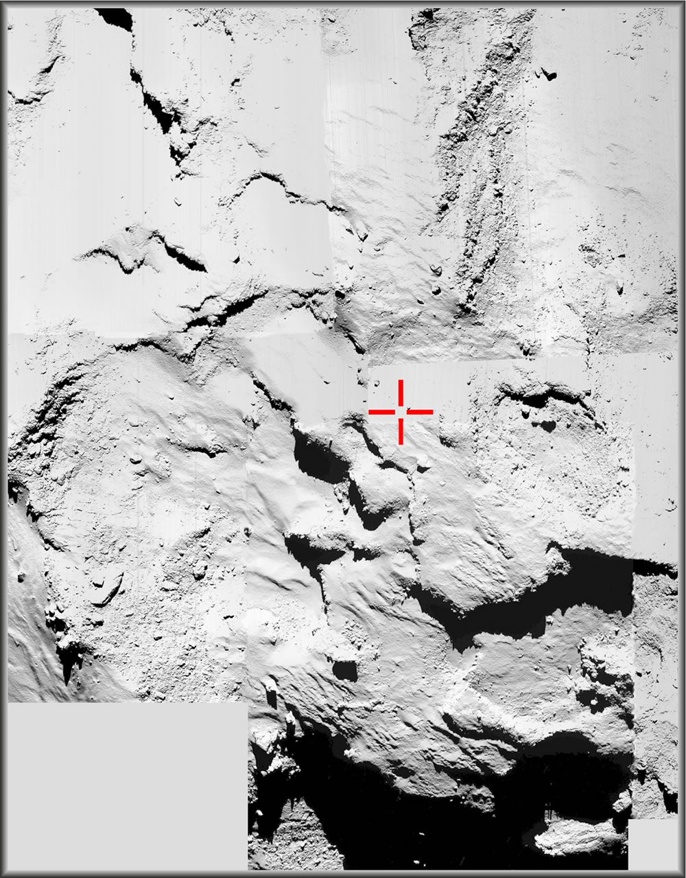 Disse Montaoge ut fief Biller bruukde man tau'n fasteleggen van dei würklicke Landestä. Dei Biller möhm dei OSIRIS-Telekamera an Bord van Rosetta an'n 12. November 2014 up, as Rosetta rund 16 Kilometer äöwer den Kometbodden was. Wohrschienlick hüppkede Philae twei Maol äöwer den Bodden, vördem dei Apparaot up siene leßte Stä stünd. Dat rode Krüz wiest dei eierste Landestä.