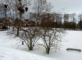Ganz bescheiden seet he an de Siet un tööv, dat he ok en Stück Appel afkreeg. Aver dat leten de swatten Amseln nich to. Se hebbt den frömden Vagel verjaagt. In de Nacht harr dat wedder düchtig sniet. De frömde Vagel weer al ganz fröh wedder dor. Dat weer en Rootdrossel. Düttmaal seet se in de mit Snee toweihte Heck. Se harr Glück. Dor weer blots een Amsel up de Terrass. De hett de Rootdrossel an en Appelstück ranlaten. De Rootdrossel is hier bi uns nich to Huus. Blots wenn dat enen strengen Winter gifft, kümmt se in uns Gegend. Se is för uns en Wintergast.