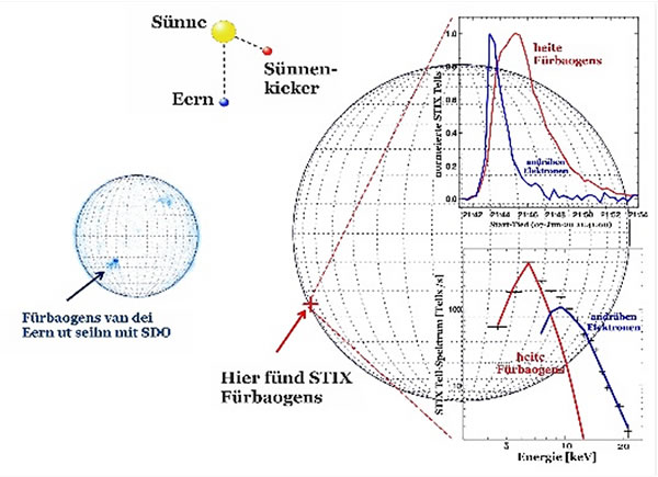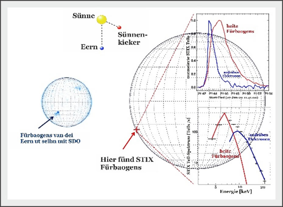 STIX ünnersöch dei Solar-Röntgenemissionen, dei meest dör andräben Elektronen (blaw) un Sünnenütbräken (rot) affstraohlt werd.