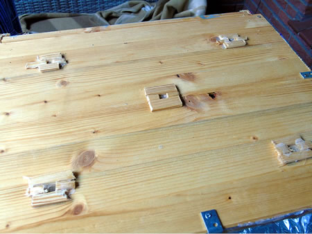 An een Siet (nich gegenöver de apen Siet, sünnern dorblangen!) bohr ik Löcker un deck ehr mit Flegengitter af. De Löcker sünd to'n Entlüften, avers dor schallt keen Insekten rinkrupen. Dorüm nehm mööglichst fienes Flegengitter. Mit'n Kleevpistool un lütte Holtleisten warrt dat Flegengitter över de Löcker fastmaakt.