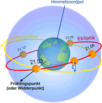 De Evene vun de Eerdbahn nöömt wi Ekliptik. Üm un bi all Planeten dreiht sik in düsse Evene mehr orr minner in grote Krinken. An de Ekliptik finnt wi ok de Steernteken, also de Biller, de Minschen in de tofällig dor verstreiten Steerns rinfantaseert hebbt un mit de se Charakteregenschapen, ja sogor Schicksalen vun Minschen verbunnen hebbt, de jüst denn boren weern, wenn de Sünn (de Sünn! Also dat Steernteken stunn denn nich etwa an'n Nachthimmel!) in düt Steernbild stunn. Düsse ""Wetenschap"" nöömt sik Astrologie. Dat is natüürlich Tüdelkraam in Reinkultur. De eenzige Steern, de Influss op dat minschlich Leven hett, is de Sünn. Un dormit kaamt wi trüch na de Astronomie, de richtige Wetenschap vun de Steerns. Avers Momang, de Eer-Ass wiest in dat Bild ja nich ganz na baven de hett doch so'n lütten Zisslaweng, oder? Ja, un dat is de Winkel vun 23,5 Grad, üm de de Eer-Ass un de Ass vun de Eerdbahn üm de Sünn gegenanner verkippt sünd. Wenn'n sik nich de Assen, sünnern de Evenen ankiekt, sünd dat de Äquator-Evene vun de Eer un de Ekliptik.