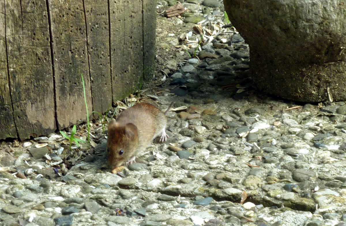 Nu müss ik aver doch mal nakieken. As ik upstünn sprung wupps de "Dacklünk" ut de Ampel an de Lattenwand. Dat weer würklich en Muus! Dörch en Ritz mank de Latten weer se glieks verswunnen. Ik kunn blots noch de Achterbeen un den langen Steert wies warrn.