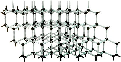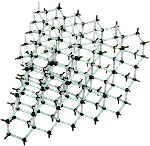 He is en kubisch Kristall mit söß spitze Ecken (Bild links). Jedeen Kahlenstoffatom gifft veer annere de Hand. Dat bildt alltohoop en unbannig faste Struktur. De twee groten Biller wiest en Utsnitt ut en Kristallmodell. |