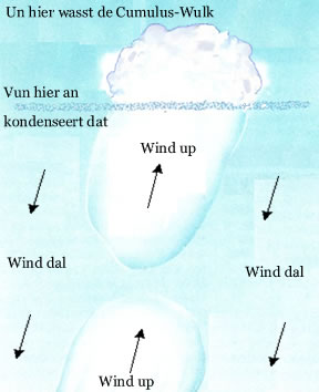 Regenschuer. In düt Bild seht ji nau, woans dat kaamt. An't best wasst de Cumulus över dunkelgröönet Land - een düstere Överflach nimmt orrig Warms op, de se denn wedder an de Luft afgifft. De warme Luft över't Land stiggt as een Bloos op, un jümmer wieder op, bet dat dar boben so koolt warrt, dat de Waterdamp in de Luft sik nich mehr oplööst hollen kann - he "kondenseert", dat heet, he warrt to Druppen. Een Wulk entsteiht! Un de wölbt sik jümmer mehr na boben, bet de ganze Luftblos boben ankamen un to een Wulk worrn is. Blangbi, "Cumulus" heet op Latiensch nix anners as Knüll, Barg, Wölbung. Un so süht de Wulk ja ok ut.