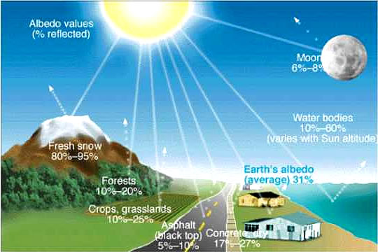 De Torüchstrahl-Kraft von een Saak warrt vun de Wetenschaplers "Albedo" nöömt. De frischfoolen Snee strahlt 85-90 Perzent von dat Sünnlicht wedder torüch! He hett also een hoge Albedo. Altosaam smitt de ganze Eer bi 31% Strahlung torüch. De Woold süht in de helle Sünn dorgegen heel swatt ut. De nimmt binah all de veelen Strahlen op. Dor warrt dat denn ok richtig scheun warm an'n Holt. To'n Glück riekt de Sünn in so'n Woold nich so richtig rünner na'n Bodden. Sünst weer dat velicht to veel. De witte Sand an'ne Küst reflekteert man ok bloots bi 35 Perzent. Dat heff ik nich dacht! De blend't doch ok so as Snee. Dat kann een sik licht vörstelln, dat de Albedo ok wichtig dorför is, dat dat op de Eer nich to hitt warrt, nich? De Woolden hebbt twoors en ringe Albedo, avers se benütt de Strahlung dorto, den Kahlenstoff ut de Luft to fischen un Suurstoff natoschuven; un dormit daat se dat Klima good. Avers wenn de Snee un dat Ies ganz verswinnt un de Eer mit swatten Asphalt toplastert weer, oha, dat güng leeg ut! |