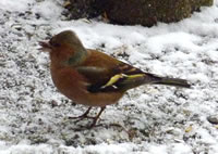 In de lütt Bost liggt en bannig groot Hart, dat sleiht veel sneller as bi de Minschen. Un de Lief is in Sommer un Winter so 40° C hitt, un so mutt dat ok sien. Dat kost natüürlich veel Foder(Energie), dormit de Vagel jümmer so warm blifft. Uns Bookfink wiggt jo man eben so veel as'n Breef bi de Post. Wat meenst, wat de Wind dörch den lütten Keerl dörchhuult! Un fleegen mutt he ok noch jümmer. Dorüm hett he allerhand Luftbüdel in sien Lief, de em bi'n Flegen beten helpen. Sogoor de Knaken sünd mit Luft füllt un nich mit Mark, as bi uns Minschen. He hett ok keen Teen, he hett 'n lichten Snavel ut Hoorn un keen Nees, bloots Neeslöcker. Dat meiste Gewicht an den ganzen Vagelkopp hebben de Ogen. Jo, wi weeten dat jo all: De Vagels köönt hellsch goot kieken. Nix gifft dat, wat se nich sehn. De passen op, as'n Adler. | ![]() |