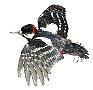 de Grote Buntspecht is so groot as'ne Duuv. Aver ne, is nich. Den Boom rünner kann he nich so goot lopen, denn mutt he eerst sien' Rückwärtsgang inleggen. Wenn he an Boomstamm sitt, kann he sik goot mit sien stieven Steert afstütten. Dat is as'n drüttes Been. De Steert is so hatt as Fischknaken. |