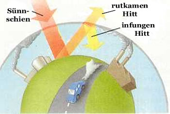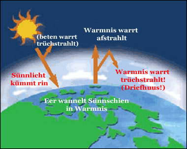 kann een nämlich li Je mehr Driefhuusgasen wi in de Atmosphäär pumpt, ümso "dicker" warrt de "Glasschicht". Dat Licht kann noch dör, avers de Warmnis kann nich mehr weg!