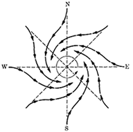 groote un lütte, Dag un Nacht. Na, wieldat de Eer sik dreiht. De Eer un allens, wat fast is, dreiht sik stüttig; man de Atmosphäre, de Lufthülle, de sitt dor recht lose op, un da meent de doch glatt, se brukt dat Dreihn nich so dull mittomaken. Un de Eer dreiht sik so ünner de Lufthülle weg, un wenn een op de Eer steiht, denn lett dat as Wind. In dat Bild köönt Se sehn, woans dat utgeiht: An'n Äquator, 'neem de Dreih-Geswinnigkeit ja an'n hööchsten is, suust de Eer man so ünner de Luft weg, un de Wind - de Passatwind - is doch ganz beachtlich. De Wind dreiht sik also nich, avers wieldat de Eer sik dreiht, lett dat, as dreih sik de Wind. Un dat passeert nu op de twee Halven vun de Eerkugel spegelverkehrt. De groten Deepdruckrebetten dreihn sik op de Noordhalfkugel gegen den Klockenwieser, op de Süüdhalfkugel mit den Klockenwieser. - De Hoochs dreihn sik denn natüürlich annersrüm. Na de Poolen to (de "gemäßigten Zonen") vun de Eer hefft wi dann eerstmol de "Westwindzoone" mit den veelen Regen un Snee un den Oostwind, de den Sünnschien un in Winter de Küll bringt. In Winter warrt de "Westwindzoone" meist breeter. Ok düt is een Gesetz. De Iesküll kummt as ne Willenlinje vun de Poolen na de lauwarme