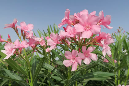 De attraktive Oleander stammt ut den Middelmeerruum un verdriggt keen Frost. He hett witte orr rosa Blöden. Alle Dele vun de Plant gellt as giftig. 15 g Bläder orrer 8 bet 10 Samen köönt enen utwussen Minschen starven laten. Dörch de Inhaltstoffe warrt allens betäubt, wat dormit in Berühren kümmt. De Mund warrt ahn Geföhl. Dat Ersticken folgt denn na ca. dree Stunnen. Ik heff leest: Soldaten in Spanien hebbt in'n Sommer 1813 Kaninken an'n apen Füür braadt, grillt. As Spieß hebbt se Telgen vun 'n Oleander sneden. An'n annern Morgen weern se alltohoop dood. 29.10.2021