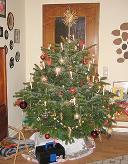 Un denn de groten roden Glaskugeln! De "mütt" an unsen Boom. Wehe, wenn de vun Wachs vull klackert sünd! Un dat passeert in jeedeen Johr. Uns Söhn hett uns graad veer niege, grote, mundblasen Kugeln schenkt, de en ganz besünner, deep Root hebbt, binah as Purpur.