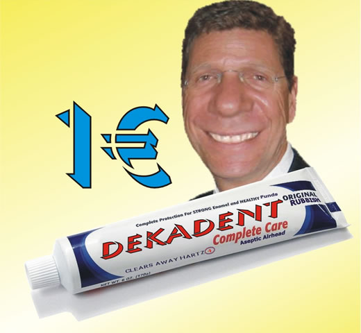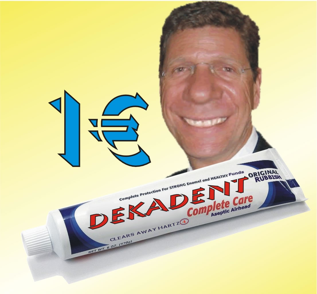 Vun Jens-Peter Bey Mit 'n lütt beten Bregensmult kann een wat warrn un brukt nich in de soziale Hängematt to dümpeln! Uns Model hier hett dat vörmakt. Is nich mehr affhängig vun een erbärmlich Salär in'n Bunnsdag. He steiht sienen Mann ok in den rusigen Wind vun uns free'e Wirtschop. Verhökert nu een niege Tähnpasta to'n Vördeelspries, de ok de Hartzers för een Stünn Arbeid tosätzlich kriegen doot. Arbeit för veele, witte Tähn för alle! As se em för dütt Foto ok noch 'ne Toga öbertrecken wulln, hett he schüttköppt un in sien bescheeden Ort meent, dat he nich öberdrieven will. "DekaDent" hier dat Original!