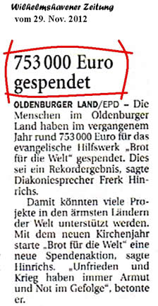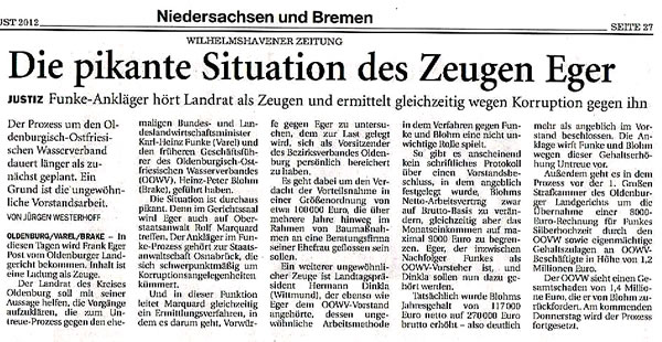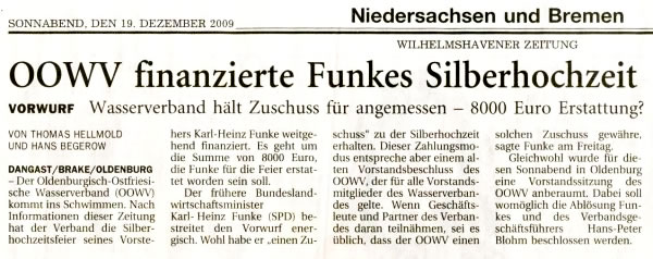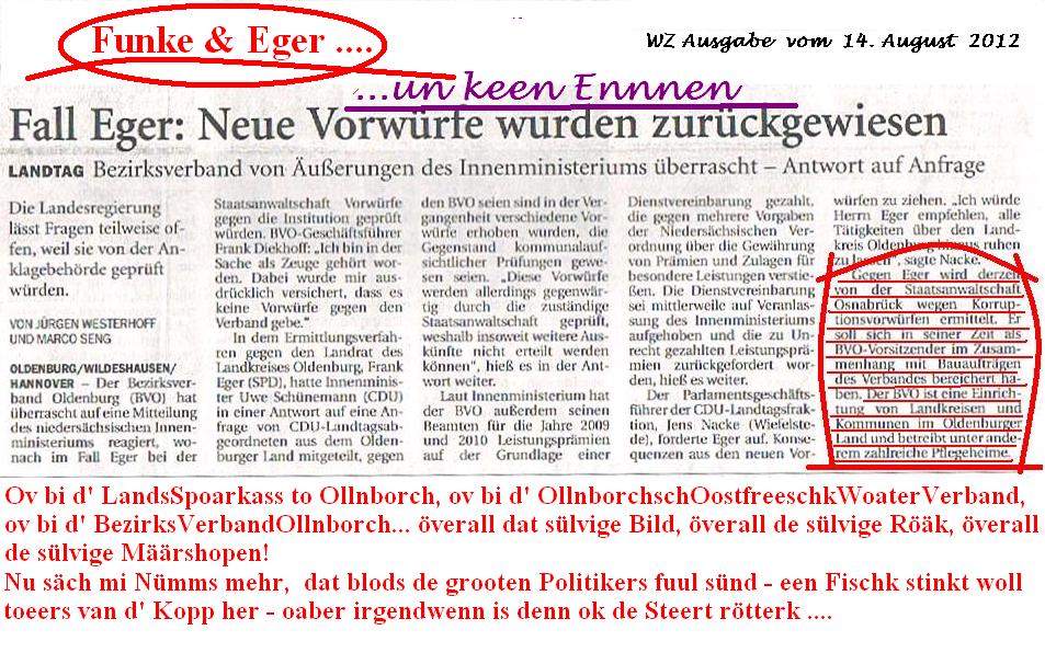 De Ex-Bulami, Handelsschoolmester un Buureninschinör dor bi Voarel in d Dangastermoor hett nich blods siene Vöörstandskolleechen bi d OOWV, sien Parteimakkers und dat heele Volk in d Kuntrei anloagen, dat sükk de Balkens boagen, as de Soak mit sien Sülverhochtiedsbetoahleree van Dach koamen is. He har dat heele Doon ok noch good vöörbereid, in de he de Verbandsgeschäftsföörer sien Gehalt moal ähm so, un oahn irgendeen anner Litt van d Vöörstand dorvan to vertelln, üm Hunnerddusend Euro upbäätert hett. Eenfak so un blods mit sien Teeken ov schull man bi Funke nich bäter särgen: mit sien Kaiser Koarlhein? Ikk kann mi eenfak nich denken, dat dat blossich de verbräkerisch friseerte Sülverhochtiedsrääken wee, de van d Geschäftsföörer föör sien Boas dör de Bööker dörschoaben worden is. Üm föör sükk sülven achtduusend Euro dorbi ruttohoalen, stäekt een Koarlhein Funke nümms Hunnerdduusend Euro in d Mors. Wenn een Buur sükk dat Waark moakt un knoied in so een lüütjied Lokk soveel Pinunsen rin de will an d Ennen sien Quäleree ok good betoalt hemmn. Villicht kriigen de Stoatsavcoaten upletzd noch een büld anner Morsen to foat, in de de Buur ut dat Dangaster Moor Doalers rinschoaven hett, üm föör sükk wat dorbi ruttohoalen Ikk loat mi moal överraschen. |