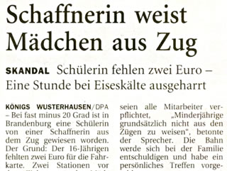 Dat Doon van de Schaffnerin in Brannenbörch ("Zugbegleiterin" heet dat joa vandoach hochdreit), de een noch kinnerhaftich 16jöährich jung Deern wägen twee Euro de see (de Boahnollschke) villicht noch nichmoal föördern drüfft har bi Nacht un bi twintich Groad Koahl ut een Zuch schmeeten hett, hett bi mi een büld Besinnen ut mien Lopen dör de Tied hochkoamen loaten. Dat dat een goodet Besinnen is, wat Froolüü in Uniförm angeit, dat mach ikk nu nett nich särgen ov see mi bi d Dennst an irgendeen Grens, ov bi d Schandarms or in Tüüchs in anner Klöären tomöötkoamen sünd, dat is liekers. Ikk hevv foaken bi mi dat Gefööl hat, dat Froominsch in Uniförm dor vöör mi geböört sükk so, as wenn see mit de Uniförm ok dat mitkräägen hett, wat van Natur ut blods een Mannsbild mitkräägen hett. De Schnakker van d Düütsch Boahn hett künnichmoakt, dat de Schaffnerin sükk entschüllicht hett un dat hör dat nu leed dee. Wu kann een Minsch sien Doon sülvst entschülligen? He kann doch de anner de he dat andoahn hett höächstens birden, hüm to entschülligen. Un ov dat Birden denn van Haarten kummt, dat woach ikk doch to betwiefeln denn well sowat deit, de deit dat van d Karakter ut un de blivt ok noa sien Deit mi leed-Särgen meist de sülvige. |