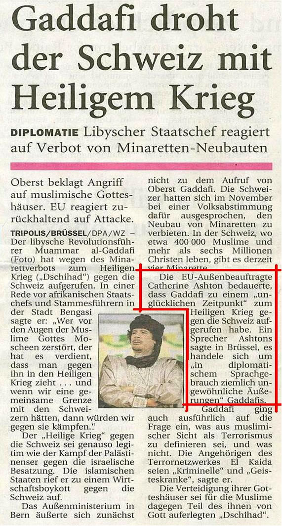 rintillt worden. Dor heeft een dördreiten isloamischen Potentoaten in de noordafrikoansche Drööchte sien Knüppel un droht de Schwiez mit een hilligen Kreech (wat de Keerl aal ümsetten kann, dat hett de Weltgemeenschkupp joa all dääch genooch to weeten kräägen) un de buterwendige EU-Verträäderin weet dorup niks anners to särgen, as dat för disse Drohung Gaddafis woll een bietji de verkeerde Tied wee. Ikk kann disse Worden noch jümmers nich foaten un meen, dat dit Froominsch doch bäter in hör ingelsch Köäken bleeven wee. |