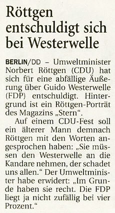Een Riech van Liberoalen vöör hum kunnen de Welt tominnst noch mit irgendwat, wat see eenigermoaten good kunnen, beindrükken. Wee dat de ole Papa Heuss mit siene Jovioalität, so dee dat bi Thomas Dehler de Intellekt. Hett Erich Mende dat noch jüüst mit sien Weltkriechs-twee-Offiziersschneid henkräägen, broch Walther Scheel dat mit sien Singeree boaben up de geele Postkutsch kloar. Wor tägen dat bi de Lambsdörpssche Groaf all een Verurdeelung wäägen Stüürachtertrekken wääsen muß. Genschers Diederk hett dat mit sien Naturell figelinsch henkräägen, de Noakriechsfolgendiplomati een minschliched Utsehn to gääven, un Möllemanns Jürn, de kunn tominnst good ut een Fleeger springen. Aal dit Geböören hett Indrukk un Spoaren achterloaten un de Tied hör Teeken updrükkt. Wekker anner Spoaren as de, bi Stoatsvisiten de Gastgeevers mit sien Annerswääsen in d Natuur vöör de Kopp to stööten schall Spaßmobil-Guido woll achterloaten, wenner de Wählers hüm to rechter Tied ut siene veelstogroode Dennstkleedoasch rutbefördert? |