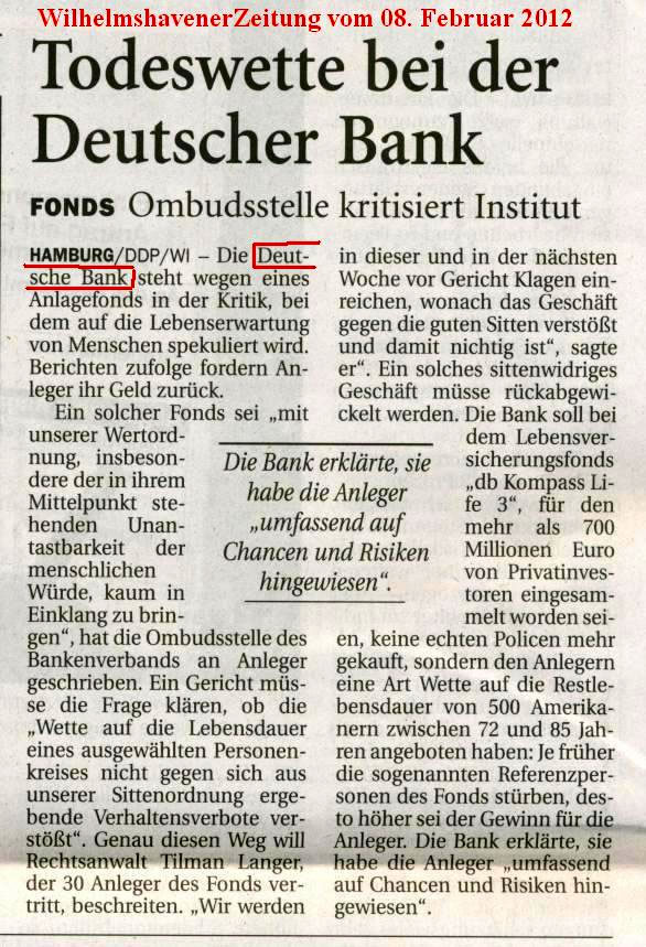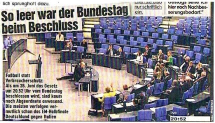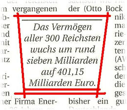 ...un schiens een Teeken van Düwelsbesäätenheit un verbräkerisch Doon tominnst in dat ole Lutherstaddje Worms is dat woll so. De Wormser Boadballibüppersten (de hevvt schiens aal mitnanner een schooner Geweeten as de Poapst) is infallen, veer Froolüü, de deelwies all een halfed Halfjoahrhunnerd Billjetts an de Boadwilligen utgääven, wägen een Koffikass mit veerundartich Euro Klöätergeld föör de Kolleechenkring to feustern. Sogoar een Stoatsavcoaten hett sükk van de Lüü anstöten loaten, ok noch de Begreepen Ünnerschloagung un Untrööheit in de Wachtschoal to schmieten. Wenner de Froolüü dat Koffigeld ut de Staddkass stiebitzt un de Kommunibööker ümschrääven harn, denn wee dat gannskeen Froach, dat see dorföör instoahn mussen wat see denn ok säker doon würn, oahn eers groodoardich de Waarkgerichtsboarkeit antoropen. Nu räärt wiers een ut irgendeen Ekk, dat dat Koffikassen-Anlärgen tägen de un de un noch een annern Vöörschrift is, un dat in son Kommunibedrijf joa Örnung hollen worden moot. Recht so, kann ikk dor blods särgen oaber ikk froach mi, wor disse Örnung denn is bi Noams as Funke, as Zumwinkel, as Hartz, as Nonnenmoaker, as Schäuble, as Regina van Dinter un aal de anner Prominenz ut Wertschkupp un Politik. Nu glööv ikk doch verraftich ok bold, dat dat in Düütschland mit dat Gerecht föör jedereen nich mehr so lieklang löpt. |