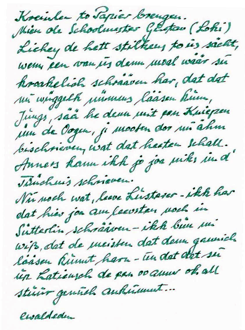 Nedderdüütsch ov hier bäter bekennt as Plattdüütsch wee bit kört noa d Ennen van de eerste Weltenbrand (de eerste Weltkreech) in Oostfreesland - so as in d heele anner Noorddüütschland ok Ümgoahns- Verkeers- un Schoolsproak vöör dat Hochdüütsche. Dat wur spitzkantich anners, as de Mestersch föör de oostfreesk/noorddüütsch Schoolen ut anner Landsträäken in d Plattdüütschland in Dennsten sett worden sünd. Van dor an wee dat goaelk, dat de Kinner in d School van nu up glieks blods noch Hochdüütsch schnakken / proten / küüren drüsen. Kinner, de ut rein plattdüütsch Öllernhuusen kwammen. Wat dat domoals mit de Kinner doahn hett, dat lett sükk bit vandoach spöären. Dit döäsich Waark van Mesters un Schoolverwalten in disse Tied hett in de Koppen van een büld Minschen dat Denken fastspiekert, dat Plattdüütsche een döäsigen Sproak is un Mischen de plattschnakken dorüm ok blods döäsich weesen köänt. Van de meesten Öllern word siet disse Tied mit de Kinners blods noch Hochdüütsch schnakkt. Ok in Huus ovwoll man dor foaken sülvst in dat Hochdüütsche nich good to Foot is. Plattdüütsch is dör Hochnöäsichkeit und Ballköppichkeit van Studeerden up de Verleeserstroat sett worden. In veele Koppen is bit vandoach dit Denken bleeven. Wi willt mit us Doon dorto bidroagen, dat dat nich so blivvt. Wi willt wiesen, dat us Modersproak een leevigen Sproak is föör dat van Güstern, föör dat van Vandoach und föör dat van Mörgen. Man moot us Plattdüütsch blods oahmen loaten un nich stoadich de Lücht ovschnöören, denn een Sproak, de föör Gewalt blossich up Döntjes un Vertelljes fastlächt ward, de is wiers bold wüggelk kollt un dod. Wi willt de Kuulengroabers van us Modersproak ton Düwel joagen, bevöör dat heel un dall to loat dorföör is. |