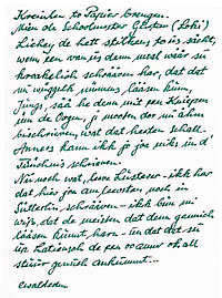 Dat kann natürlich weesen, dat blods heete Lücht ut de Kädel stoomt wenner de Dekkel doraffkummt dat kann oaber liekers netso geböören, dat, as bi een Dominospill, in de näächste Tied een büld Figürkers up dat Politikbrett riegenwies to Fall koamt un över de Hümpels in de Teppich strumpeln, ünner de see de Schwienkroam van Schwaartpinunsen, Ehrenwöär, Kufferdroagers ov Schmeergeld un Booken friseeren fäächt hevvt. Dat nu Schrievers Koarlhein (dat is doch gediegen, dat een büld Schmeerlappens in d Politik un Gesellschkupp up de Noam Koarlhein döfft worden sünd wenner ikk disse Noam mit mi rümschleepen mußt har, ikk har mi verrafftich all ümdöpen loaten) all een bietji öller is un van d Natur her joa nich mehr soveel Goods föör sien Restlääven verwachten kann, kunn d joa angoahn, dat he an to fleuten ov singn faangt jüüst so, as hüm dat över de Tung kummt. Dat kunn wääsen, dat Koch un Kohl, dat Kiep un Schäubel sükk nochmoal waarm antrekken mooten, wiel hör dat üm d Liev anfaangt to fluttern. Well nu in de bedroapen Krings denken deit, disse Szopp de is aal laang kollt, de kunn sükk woll düchdich schnääden hemmn de Pott is näämich jümmers noch reschkoapen an koaken. Dat Füür ünner de Pott word dör de noawussen Litten in de Parteien good togaang holln. Funke, Wulff, Westerwelle un Konszorten will ikk nu blods ersatzwies nöömen. Wenner Glogowski, Schröder, Özdemir, Süßmuths Ritoa, Möllemann un wu de Vöördeelsnäämer aal heeten hier noch upföährn wull, kunn de Bott woll nich langen wiel de Zumwinkels ut de Weertschkupp un de Nonnenmoakers ut de Bankenwelt ok aal dortogehört. Nu kann ikk blods särgen. Loat us ovtöven wat dor kummt un ov dor överhaupts wat kummt. |