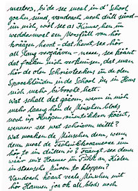 In de Tied, as wi föör dat Undöäch, dat Dummtüüchs, dat Kinner joa sied alle Tieden moaken, van us Öllern noch de een ov anner Loach Hau kreegen, de Tied, as de Schoolmester us ok woll moal över d Knee lärgen drüß, de Tied, as wi vöör de Stroaf, de us verwachten de, noch trillerden, wenn wi denn een Tschako üm de Ekk buugen sehn in de Tied hett dat sowat nich geeven. Ikk froach mi nu un dat nich eers sied disse Noaricht , ov dat, wat use Gesellschkupp dör de grötter Kinnerfreeheit towunnen hett, tägen dat, wat hör dordör verlüstich goahn is, de Wacht hollen kann. Mi dücht, dor is wat bannich scheef in use Örnung. |