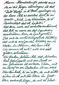 Is dat noch Oostfreesland? Joa dat is Oostfreesland dat is us Oostfreesland - man dat van vandoach! Jümmers wenn ikk över de Grens liekers van wekke Sied in Oostfreesland rinfoahr, scheeten mi disse Worden van Hannes Flesner dör de Kopp. Un ikk moot dat ingestoahn son heel bietji anners word mi dat denn stilkens tomoot oaber dat licht woll in d Natur van us Minschen. Dat düürt meesttied schmoals nich laang, denn bün ikk wäär blied bün eenfach blied, wäär in Huus to wääsen. Ikk spöär mien Haartblood up mi doahl lopen, wenner mi dat eerste Moin tomööt kummt. Huusen schoon un schier nargens up d Welt is dat so woahr as in Oostfreesland un so freedelk is dat hier. Stäelt jo moal vöör, de Oostfreesen ween sükkse Hittköppen as de Minschen dor ünnern in dat hillige Land, wor ümto de Muselmanen hausen ov wi bruken heel nich so wiet to kieken up dat Stükkji Grund, dor an de Westenkant van dat ingelsche Eiland, dor wiest man de Welt joa vandoach ok noch hoast elker Dach, wo dat so geit mit Hauen un Stääken. Wi de wi in de ollnborgsche Kolonii in d Oostdeel van Oostfreesland us Huusen hevvt mooten eelich elker Dach up Kneen us Herrgott dorför bedankt särgen, dat de Noabers in Oostfreesland Minschen sünd, för de een lüütji Köpke Tee een hoogeren Wert hett, as de gröttste Kanon. Liekers givt dat oaber ok in Oostfreesland Ossenkoppen genooch. Dat wiest see us elker Dach un foaken genooch in de lütji hooge Politik. |