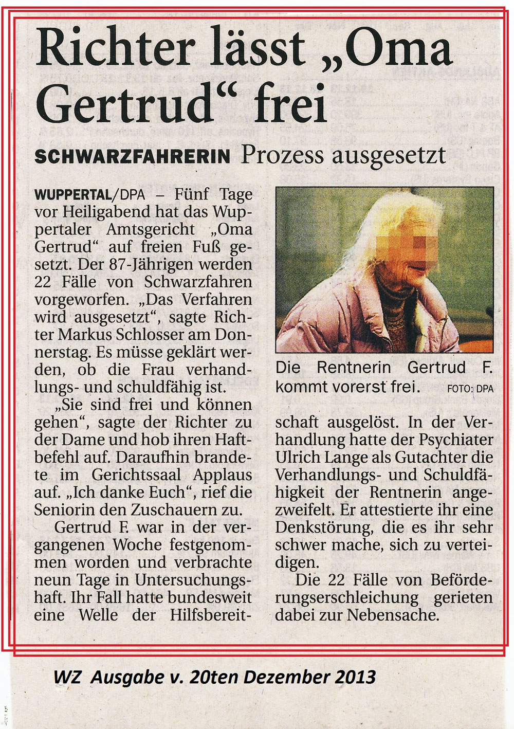 Dor hett doch de Gerichtsboas verrafftich een oled Minschke to Winachten buten de Kaschottdören sett't. Dat man in Düütschland een oled Minschke in su een hilliged Öller wäägen een poar Billets för de Stroatenboahn nich betoalen överhaupts achter Schlött brengt dat is alleen all een Schandoal. Eers recht, wenn man bedenkt, dat bi us up de anner Kant Milljonenbedreegers in Freeheit un sogoar in Amt un Würden blievt. Ikk hevv denn oaber moal sinneert, wu dat woll is, wenneer dat heel anners wee. Man schull sükk ok dat näämich van twee Sieden bekieken.